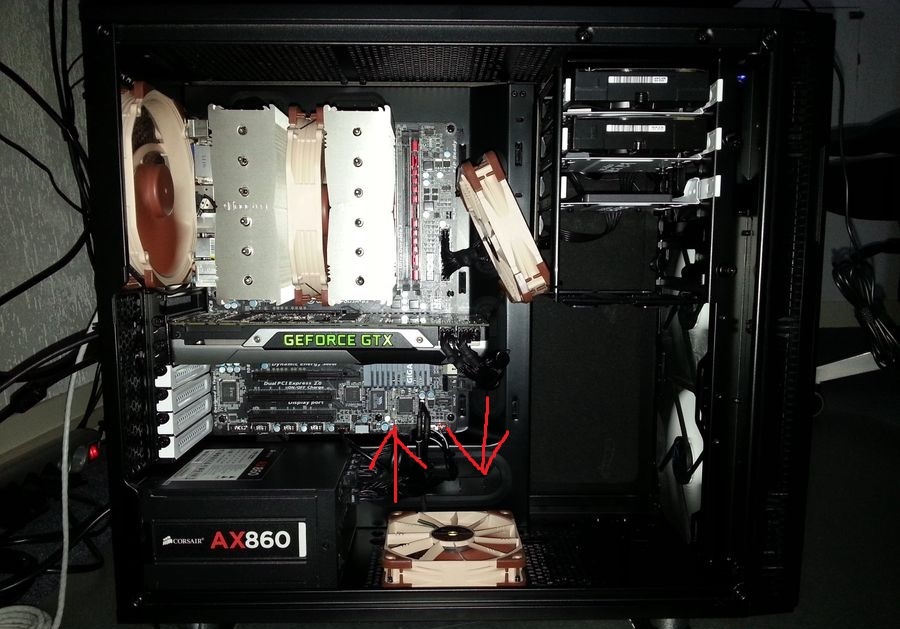 Хочу собрать СВО в Define R5. Я рассчитываю не ухудшать звукоизоляцию/пылезащищенность корпуса, поэтому вариант с большим радиатором сверху отпадает. Думаю над такой схемой