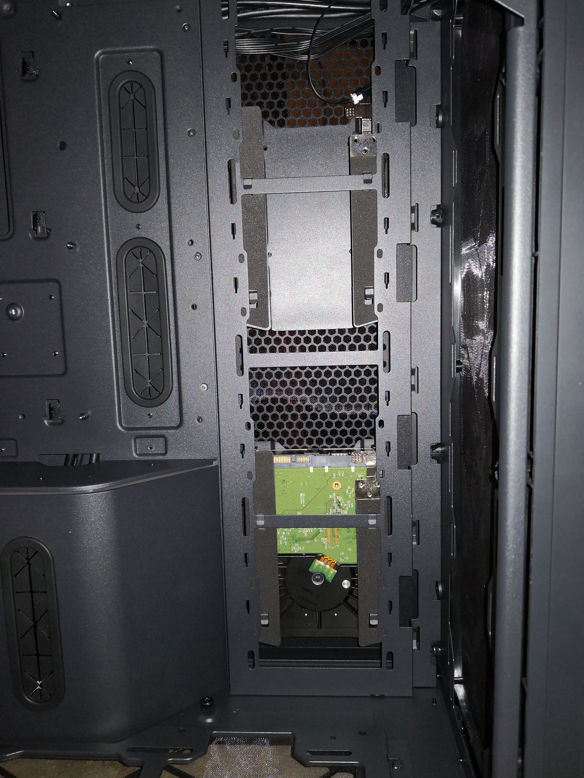 Купил Pro 2. Хочу в него перенести систему, собрав новый водяной контур. Единственный момент, что как и в 719 модели они пожопились на лишние сантиметры, и спереди под сеткой не разместить вентиляторы, т.к. там всего 20мм. Только если тонкие, но тонких тихих 140-к нет. Поэтому рассматриваю два варианта установки HDD. В одном случае вешаю их как предполагает производитель, но лишаюсь одного вентилятора на радиаторе. Во другом случае можно повесить вертикально на заднюю стенку, родных загагулин хватает как раз закрепить; но дополнительно можно какие-нибудь уголки установить, просверлив дреммелем под них крепления. Но вот, что расстроило, так это виброгашение. Возможно это из-за того, что корпус пустой и поэтому такие вибрации. В текущем Tt V71 слышен только шелест шпинделя, к-ый чуть громче вертушек, работающих на минималках. Тут же именно вибрации с подхрустыванием.