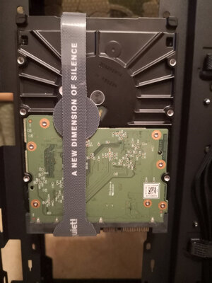 В общем, пока нашёл один способ нормально повесить HDD и как-то их задемпфировать - это на лентой-липучкой повесить к корпусу. Хотя полностью не получиться, тут вибрация идёт во весь корпус. Для сравнения в старом Tt V71 самая стойка для корзин почти не создаёт вибраций. Но в нём более толстый металл и отдельная стойка для этого дела в отличии от Фантекс. На фотках конечно ленты мало. Взял то, что было. так то надо с Али заказать пару метров и нормально с нескольких сторон притянуть.