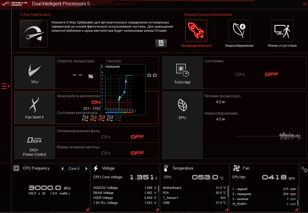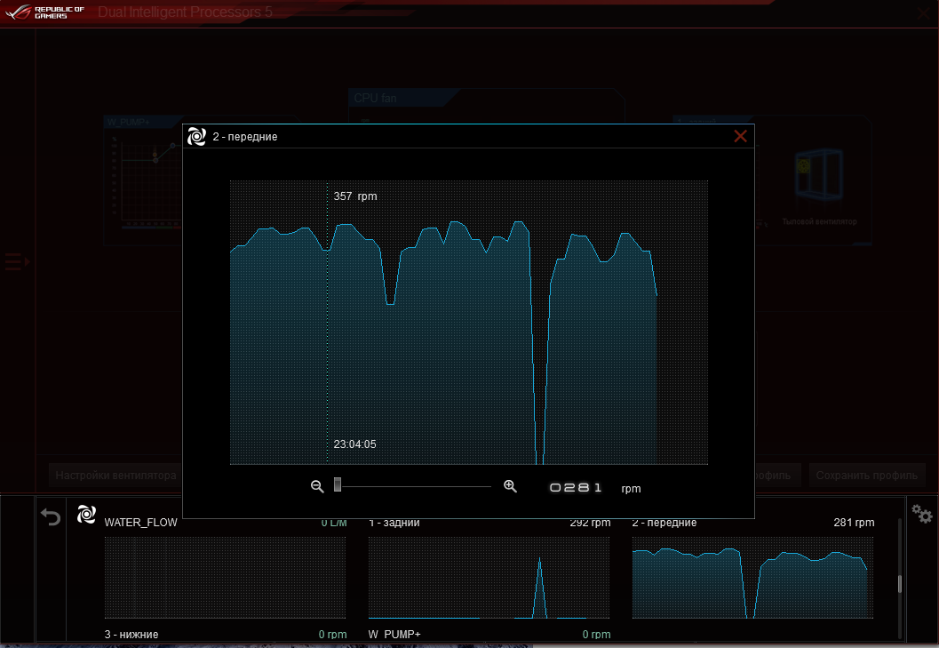 Лучше повесить на него 2 корпусных фронтальных. Процессорные - в 2 штатных процессорных гнезда. Обычно они управляют синхронно. 2 остальных разъема - выхлопной и нижний. Если захотите поставить внизу 2 вентилятора, включайте их через Y - разветвитель. Вниз лучше ставить тихие. Их при прочих равных слышно лучше фронтальных: шумка их не давит или давит слабо. 2 Noctua NF-A14 внизу на максимальных оборотах шумят очень сильно. Касательно утилиты от Asus есть сомнения. Попробуйте. Покопайтесь на сайте вашего производителя. У них может быть свое решение.