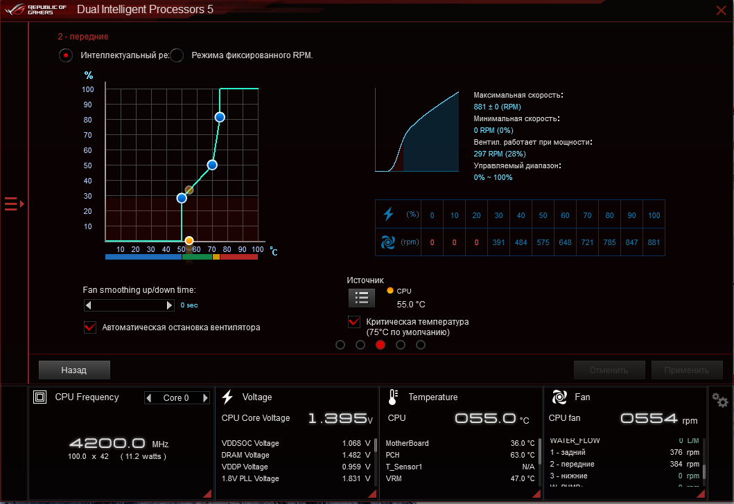 Для всего этого хватает и материнской платы, поэтому хаб незадействован. Поставил AiSuite для управления вертушками - в ней фракталовские в тихом режиме крутятся в районе 200-300 rpm. Тишина полнейшая.
