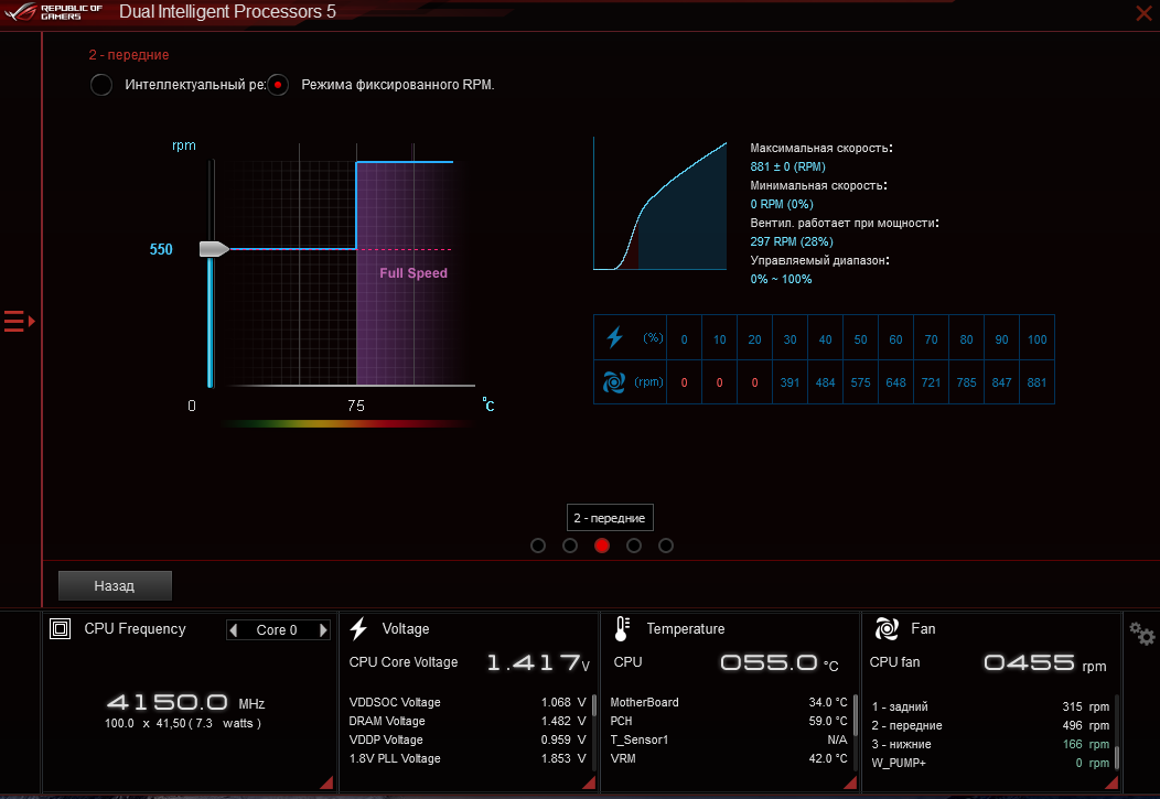 А вот если перейти в "Режим фиксированного RPM", то там, действительно, для X2 GP-14 минимум прописан в 550 об./мин. Видимо, работа на пониженных оборотах возможна только через кривую.