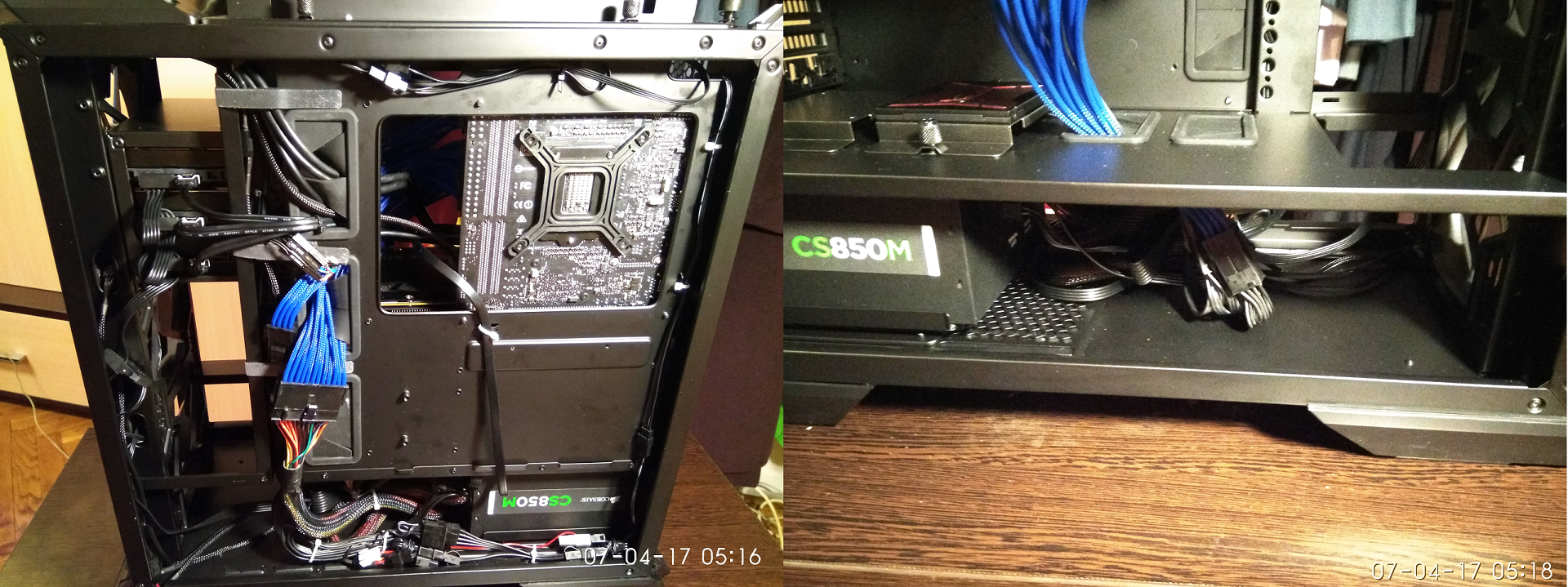 4. Моддинг MasterCase Pro 6 выпускается в 2-х вариантах подсветки - красная и синяя. Лично я предпочитаю синий цвет. Реализация подсветки интерьера корпуса с помощью заднего вентилятора с подсветкой - очень сомнительное мероприятие. В реальности оказалось не так все насыщено и красочно как на рекламных картинках. Основная подсветка - это подсветка нижней части фронтальной панели и стола с помощью предустановленной LED-ленты. Поэтому для более полноценной подсветки интерьера была приобретена синяя LED-лента Nanoxia (30 см), которую разместил в верхней части корпуса. На БП и ВК удлинители с индивидуальной - GELID 5. Кабельменеджмент В MasterCase Pro 6 для прокладки кабелей вполне хорошие условия: около блока питания можно уложить даже самые длинные кабели и с тыльной стороны корпуса запас расстояния 25-35мм. Большим плюсом является наличии вертикальной ниши с многоразовыми хомутами. Что бросилось в глаза - очень малое количество мест возможного крепления одноразовых хомутов. Но в целом это никак не помешало попрятать все провода без создания проблем с закрыванием боковой панели.