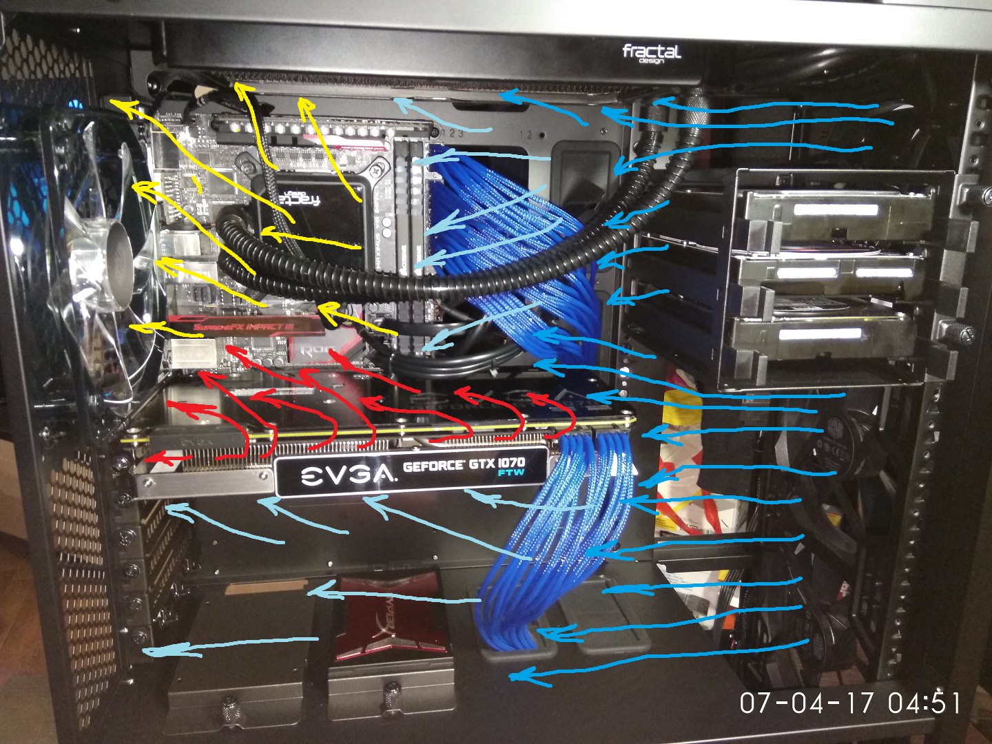 Для того чтобы не создавался тепловой карман под видеокартой, я поднял корзину HDD максимально возможно выше. Таким образом чтобы нижний край корзины оказался выше видеокарты. Таким образом полагаю создался поток без завихрений обдувающий видеокарту и снизу и сверху. Тем самым уводя из корпуса нагретый видеокартой воздух.