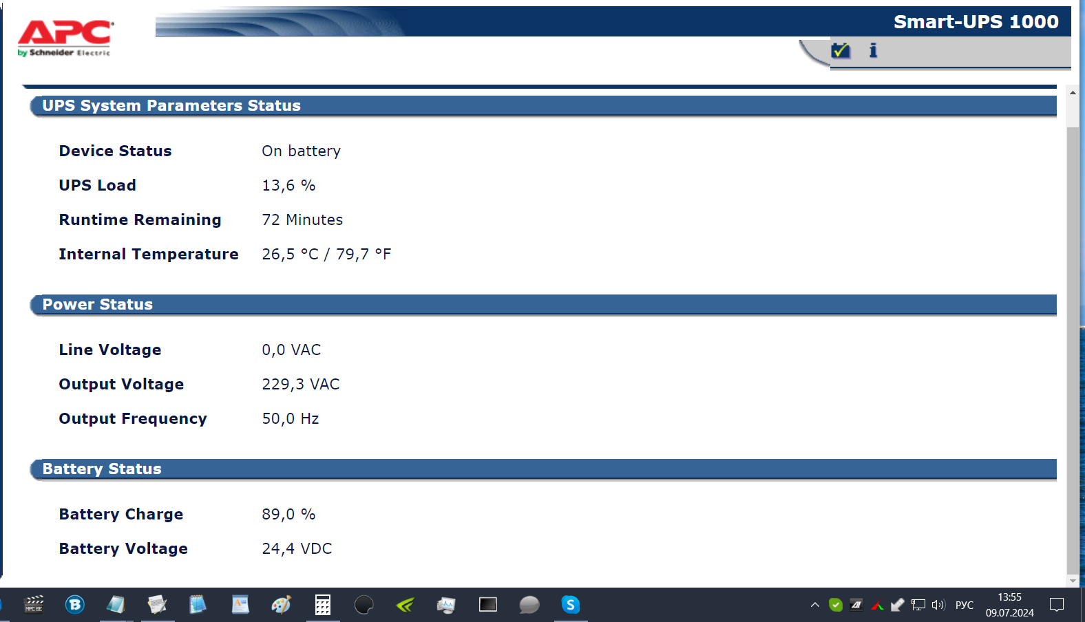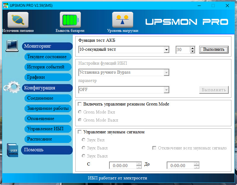 Ну у меня ПО такое не умеет, мониторинг и не более. На батарее ибп выдает +-220 В.