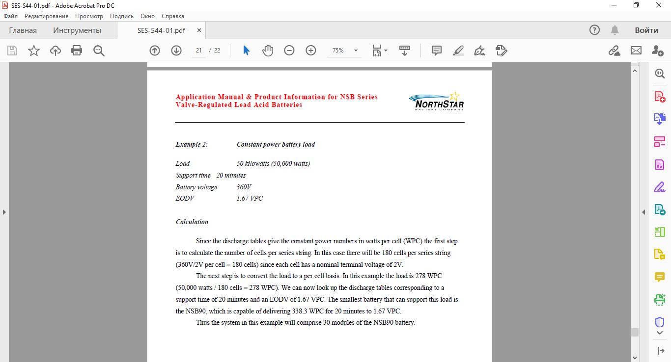 Расчет Поскольку таблицы разряда дают постоянную мощность Munbers в ваттах на ячейку (11K) на первый шаг для расчета количества ячеек на строку серии. В этом случае будут я клетки на строку серии (360 В/2 В на клетки 180 клеток), поскольку каждая клетка имеет номинальное терминальное напряжение 2 В. Следующим шагом является разработка нагрузки в соответствии с ячейкой. В этом примере нагрузка 278 (50 000 Вт / ISO -клетки = 278 ILK). Теперь мы можем искать таблицы разряда, соответствующие предположить время 20 минут и EODV 1,67 В? Самая маленькая батарея, которая может поддерживать эту нагрузку NSB90, который способен отправлять 338,3 в течение 20 минут до 1,67 ITC. Таким образом, система в этом примере будет включать 30 модулей батареи .