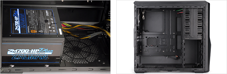 Настала пора перейти к делу - сборке системного блока, упомянув некоторые нюансы. Первым делом в корпус желательно устанавливать блок питания. Его расположение может быть вентилятором как вниз, так и вверх. Производитель предупреждает, что в случае сильно запыленного помещения, БП лучше размещать «вертушкой» вверх. В этом случае проникновение пыли внутрь «питальника» будет заметно меньше. Блок размещается на специальных круглых резиновых подставках, приклеенных к выпуклостям на днище корпуса. И хотя вентиляционная решетка для забора прохладного воздуха выглядит куцей, образовавшееся расстояние не даст БП «захлебнуться». В моем случае блок питания был размещен вентилятором вниз.