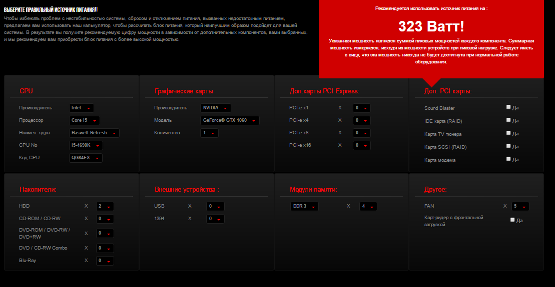 ~ Online калькуляторы по расчёту мощности блока питания Калькулятор от Extreme OuterVision Калькулятор от be.Quiet P.S. Надо понимать то, что данные калькуляторы дают примерную мощность блока питания под указанную Вами конфигурацию.