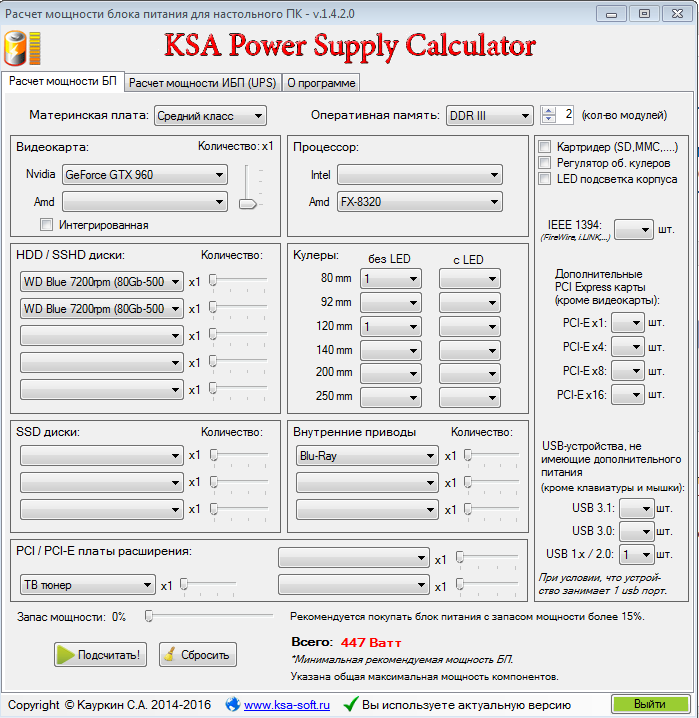 ~ Online калькуляторы по расчёту мощности блока питания Калькулятор от Extreme OuterVision Калькулятор от be.Quiet P.S. Надо понимать то, что данные калькуляторы дают примерную мощность блока питания под указанную Вами конфигурацию.