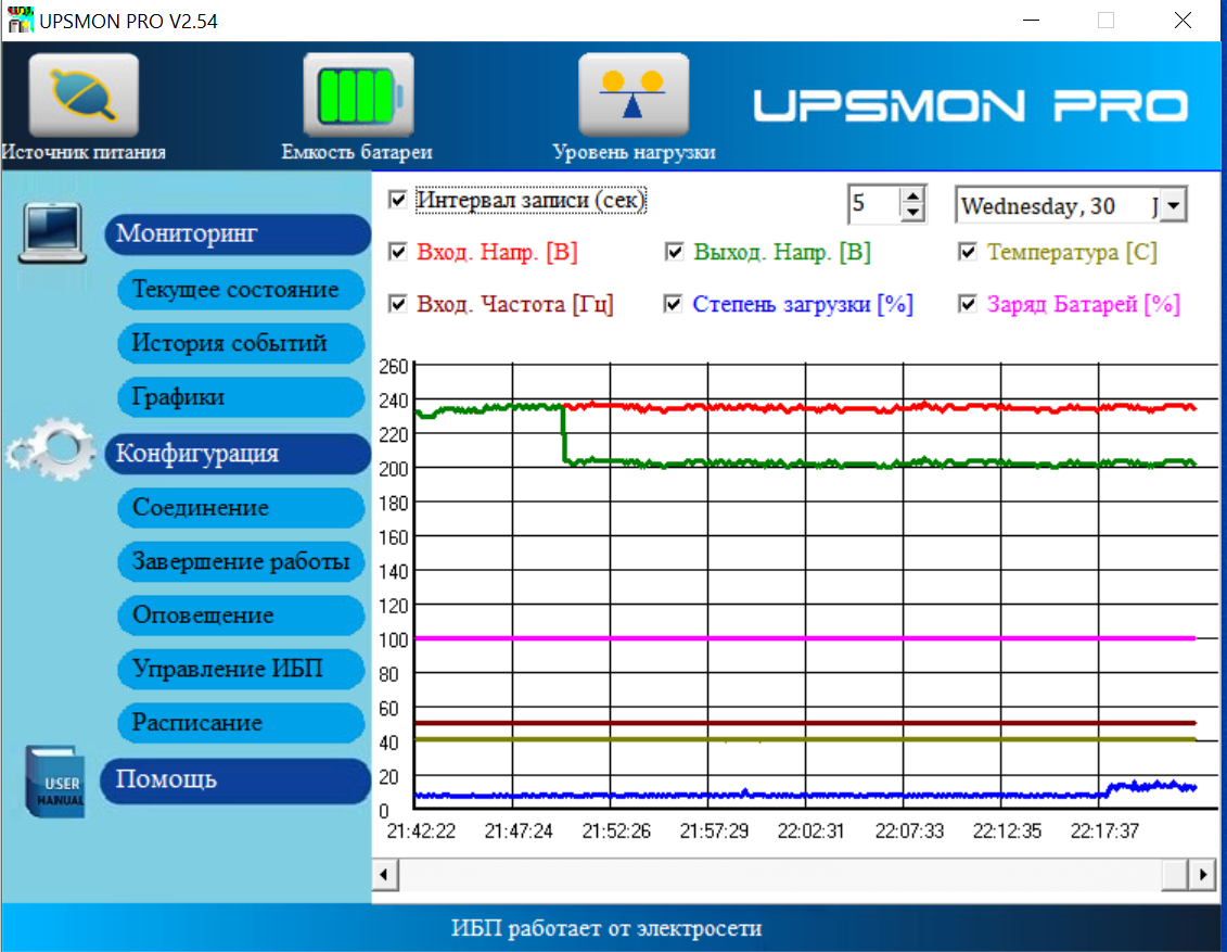 подскажите почему может быть такое, что выходное напряжение стало 200, вместо 220 прикрепил график с мониторинга, видно что в какой-то момент напряжение просто падает до с 220 до 200. другие параметры не меняются. Периодически опять происходит возврат к 220 и опять на 200. девайс новый PCM Smart King Pro+ SPT-1500-II LCD