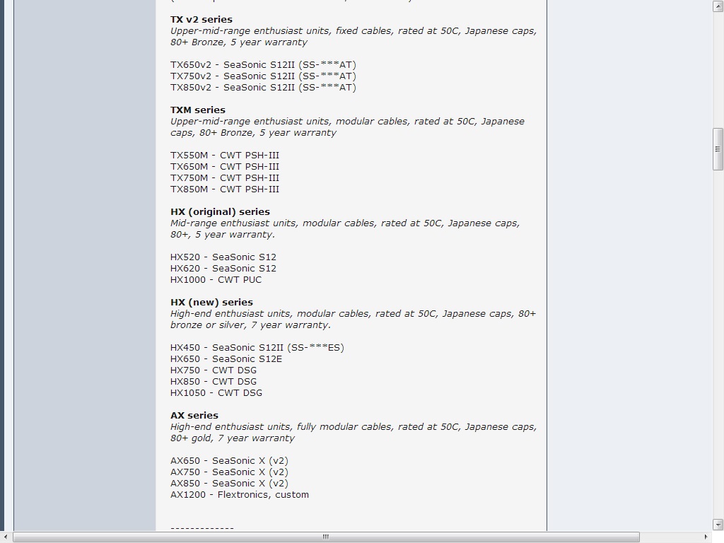 alex000white Techpowerup тестирует шумность исключительно под высокими ambient температурами, в результате у них практически все БП шумные. В реальной жизни такая ситуация в меньшинстве случаев. Меня уже в ЛС спрашивали, почему не удается заставить крутиться вентилятор у RM550/650 (хотя по Techpowerup на 50% мощности уже должен раскручиваться). Вот этот момент мне не нравится. Gabriel Torres почему-то не смог указать OEM-производителя Silverstone Strider Gold Evolution 750W, хотя там все очевидно (м.б. просто не захотел?). Что касается Chieftec GPM-xxxC, тут даже думать не надо - Chieftec сам все написал. Впрочем, на 100% уверен, что Вы это уже видели.