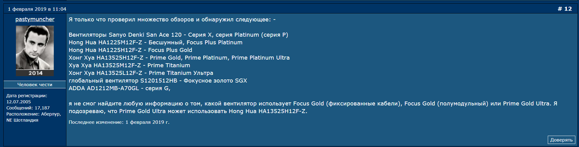 Слух - да, мозг - нет. Кстати, открылись все 4 страницы сайта JonnyGURU с информацией о вентиляторе Hong Hua HA13525H12F-Z в БП Seasonic. http://www.jonnyguru.com/forums/showthr ... H12F-Z-fan Ниже, в скриншоте, тоже полезная имфа: