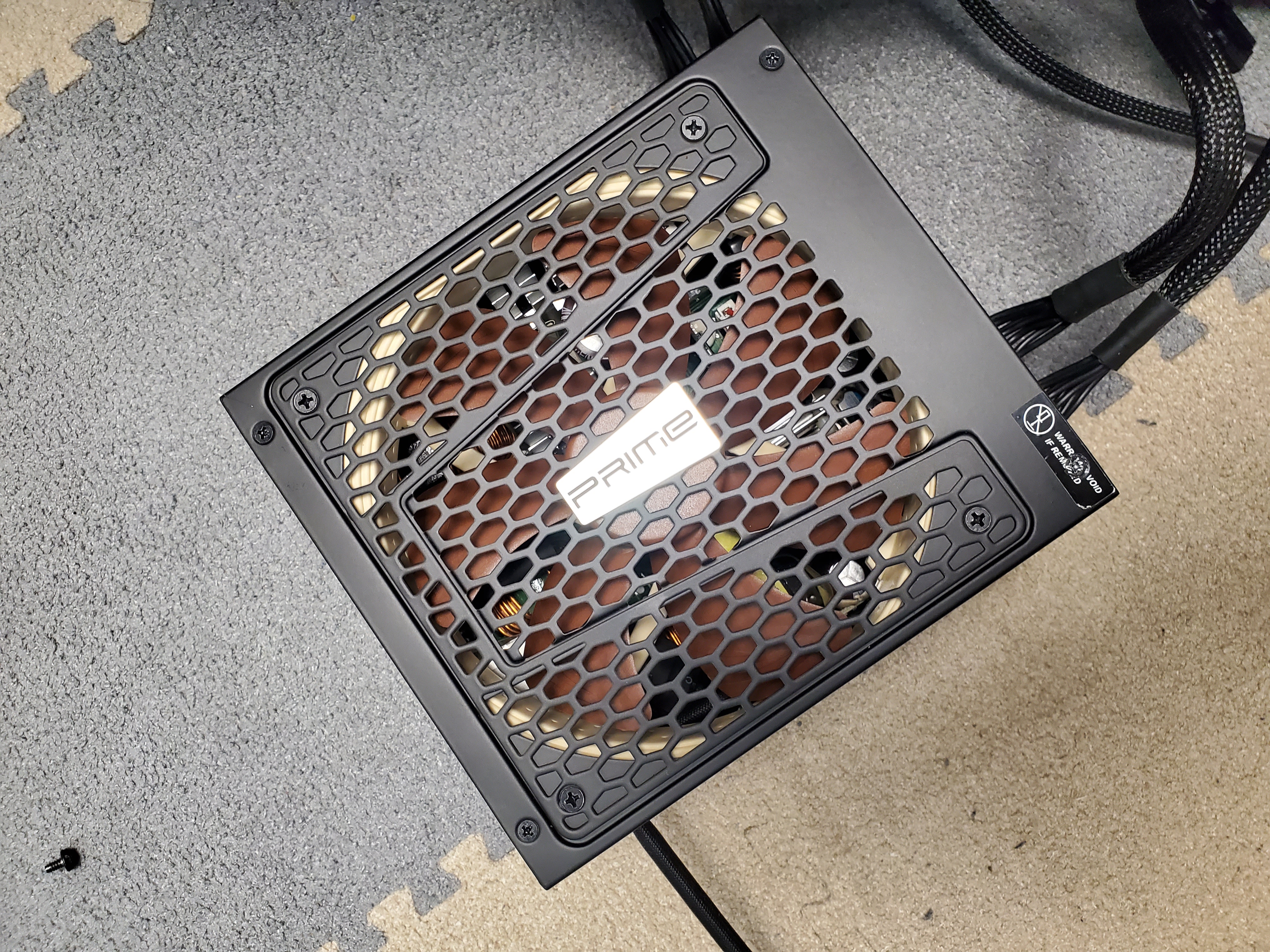 стоит внизу, вентилятором вниз (по другому не поставить). Воздух всегда гонит холодный из себя. До Сисоника стоял платиновый Корсар 750вт - вообще его ни разу не слышал в работе, но 2080ti на нём звучала дросселями. Поставил Сисоник - карта стала бесшумной, зато блок питания запел)))