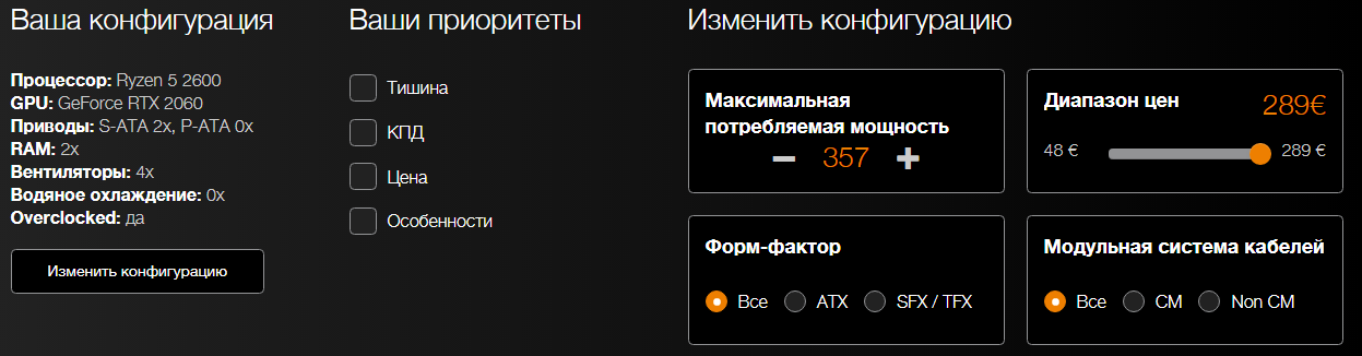 - Укажите точную конфигурацию вашего ПК, включая модель корпуса - Наличие/отсутствие разгона - Укажите бюджет на покупку (можно ли двигаться в бОльшую сторону от него или нет) - Магазин/город для ориентации в ценах и ассортименте (в разных городах/магазинах ассортимент может отличаться как по наличию, так и по цене) - Планируется ли апгрейд процессора и/или видео карты. Если да, то примерный уровень апгрейда - Какие-то другие пожелания (подсветка, модульность, тишина и при каких нагрузках).