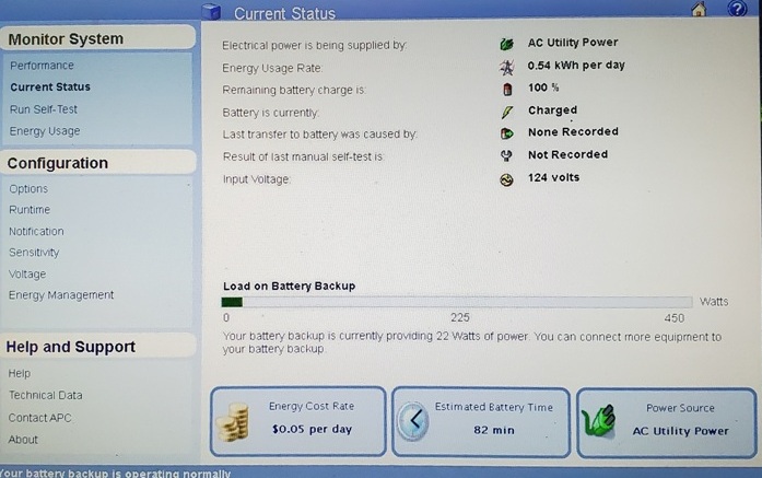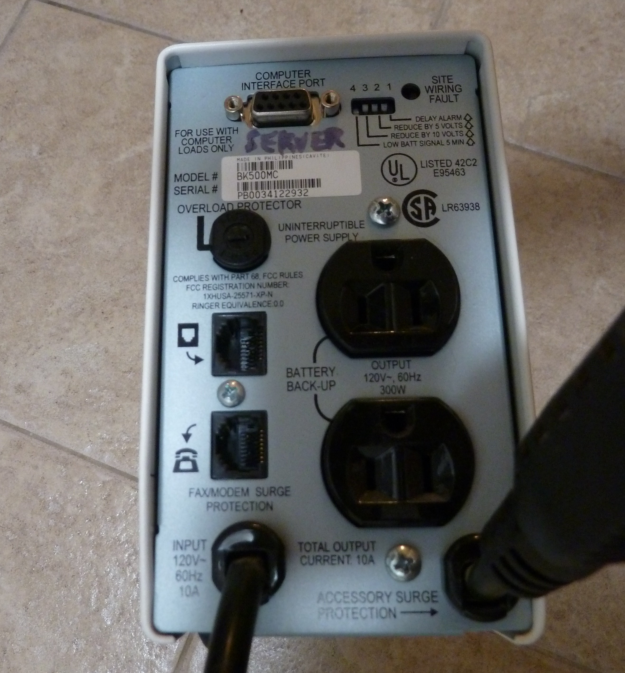 Действительно нагрузка маленькая. Читаю: Адаптер питания NAS который выдаёт 12V при 110-120V рейтинг 32W. Адаптер Интернет раутер-модем при 110-120V 1.5A, на самом приборе 12V 4.6A. Адаптер телефона Bell при 110-120V рейтинг 5W. Изредка периодически кратковременно подключается внешний бэкап-накопитель (один жёсткий диск) на время переписывания. Иногда вижу кто-то подключает к порту USB смартфон на подзарядку. Вот и вся нагрузка. Работа на батарее у нас имеет смысл чтобы предотвратить моргание при кратковременных перебоях в сети, и чтобы плавно без эксессов выключить раутер, NAS, телефонный адаптер при затянувшемся на более чем 2-3 минуты обесточивании. В офисе компьютеры пользователей не имеют ИБП, в работе используется много разного электрического оборудования, и вся работа останавливается при перебоях в сети. Персональные компьютеры потом придётся заново включать.