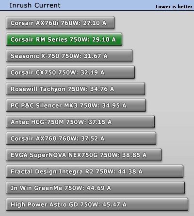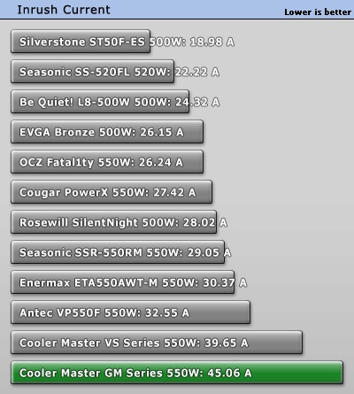 Inrush current or switch-on surge refers to the maximum, instantaneous input-current drawn by an electrical device when first turned on. Because of the charging current of the APFC capacitor(s), PSUs produce large inrush-current right as they are turned on. Large inrush current can cause the tripping of circuit breakers and fuses and may also damage switches, relays and bridge rectifiers; as a result, the lower the inrush current of a PSU right as it is turned on, the better.
