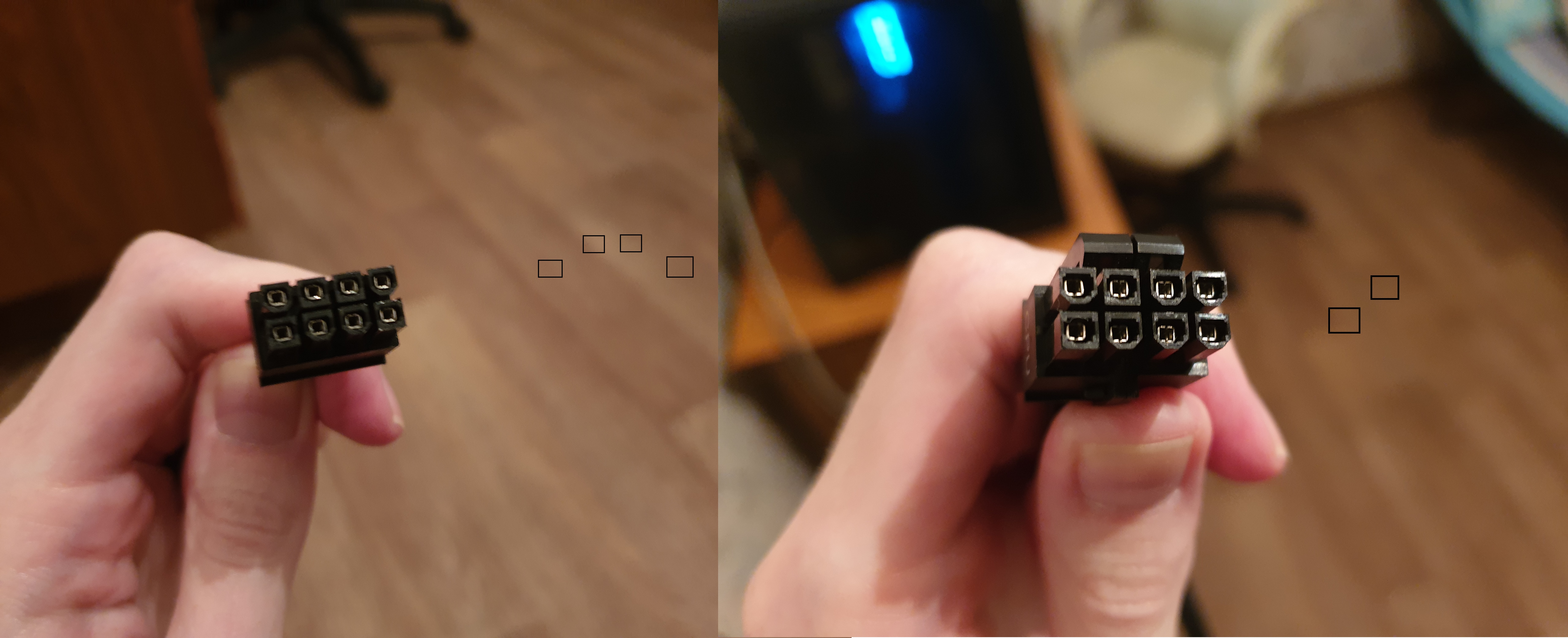 Здравствуйте, мне очень нужен ваш совет Купил блок питания и сомневаюсь как правильно вставить 8пин вот смотрите на картинке слева, на старом БП у меня 4 квардатика в вилке этой а вот в новом БП справа - только 2! Это так и должно быть?? в смысле, у меня на двух проводах именно вот так 4+4 пин с такими 2мя квадратами