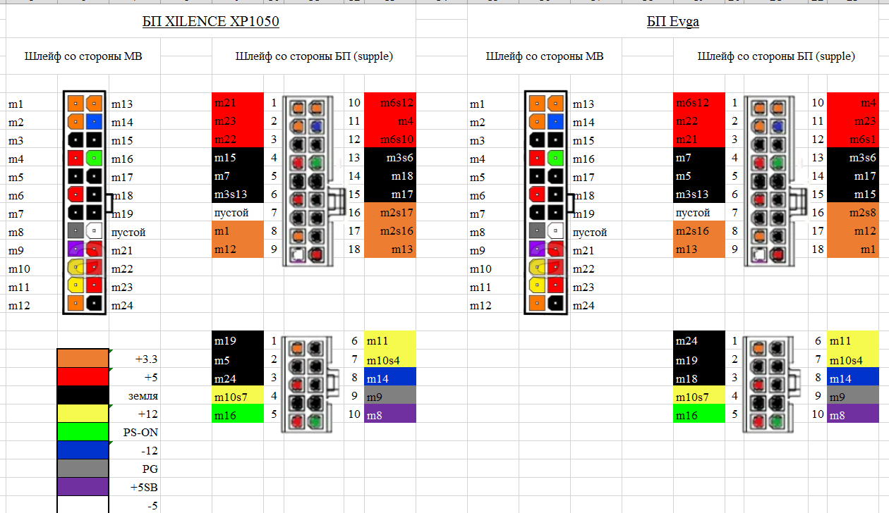 Нужна помощь, подсказка. Есть БП Xilence у него все кабели съёмные (но сами кабели отсуствуют), хочу воткнуть кабель в него от БП EVGO. Вопрос по кабелю который идёт к MB. Распиновка у штекера со стороны БП у EVGA и XILENCE отличаются, НО если смотреть напряжения на штекере который вставляется в "мать" соответствуют штатному. Вопрос: кроме напряжения какой то сигнал по силовым проводам передаются или нет, могу ли я без опаски подключать кабель на MB от БП EVGO в БП Xilence XP1050? Вот прикладываю скрин распиновки двух кабелей от разных БП