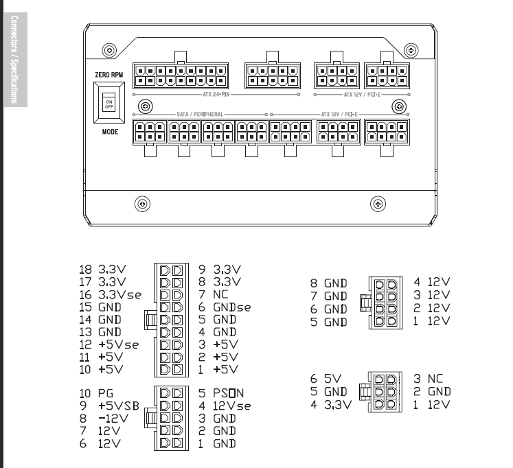 1) - Разъем для подключения Флоппи-дисковода. Максимальная нагрузка на контакты - 2А. Суммарная мощность - 34 Вт 2) - Разъем "Molex" для подключения старых HDD CD\DVD приводов периферии. Нагрузка на контакты - 11А, мощность - до 187 Вт на разъем 3) - Разъем для подключения устройств с интерфейсом "SATA". На каждый провод выделено по три контакта в разъеме. Нагрузочные характеристики соответствуют разъему "Molex" 4,5) - Разъем 6+2pin (8pin с отсоединяемыми 2pin для совместимости с разъемом 6pin) и 6pin для подключения питания видеокарт. Совместим с видеокартами имеющими 8pin питание и 6pin - (два контакта не задействуются). Мощность нагрузки от 75 Вт до 280 ватт (6pin) или от 150 до 430 ватт (8pin) в зависимости от примененных контактов - подробнее: по этой ссылке 6,7) - Разъем 8pin или разделяемый 8pin (4+4pin) для питания процессора. Нагрузка от 192 Вт до 288 Вт для 4pin. 8) - 24-контактный основной разъём для подачи напряжения на материнскую плату. Может иметь отсоединяющиеся 4pin (20+4pin) для совместимости со старыми материнскими платами. Максимальная суммарная нагрузка на разъем от 373 Вт до 684 Вт в зависимости от примененных контактов. Напряжения и допустимые отклонения, размах пульсаций: