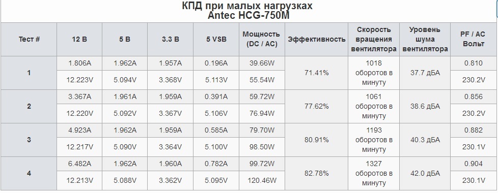 кто это сказал ? Antec HCG-750 - эта модель в серии High Current Gamer M имеет независимые импульсные преобразователи напряжений +5В и + 3,3В на схемотехнике Seasonic AM, все остальные БП меньшей мощности этой серии используют классическую платформу Seasonic, кпд модели на 750Вт не меньше более младших моделей цифры это подтверждают даже при нагрузках 40Вт, а при нагрузках 370Вт и больше модель "большей" мощности показывает бОльший кпд