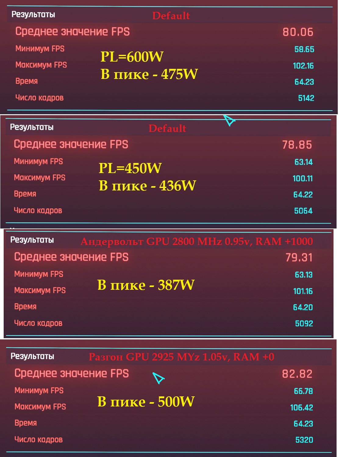 Вот я проводил тесты в Киберпанке с разгоном, андервольтом и в стоке с разными PL. Разница в потреблении - 110W, в FPS - мизерная