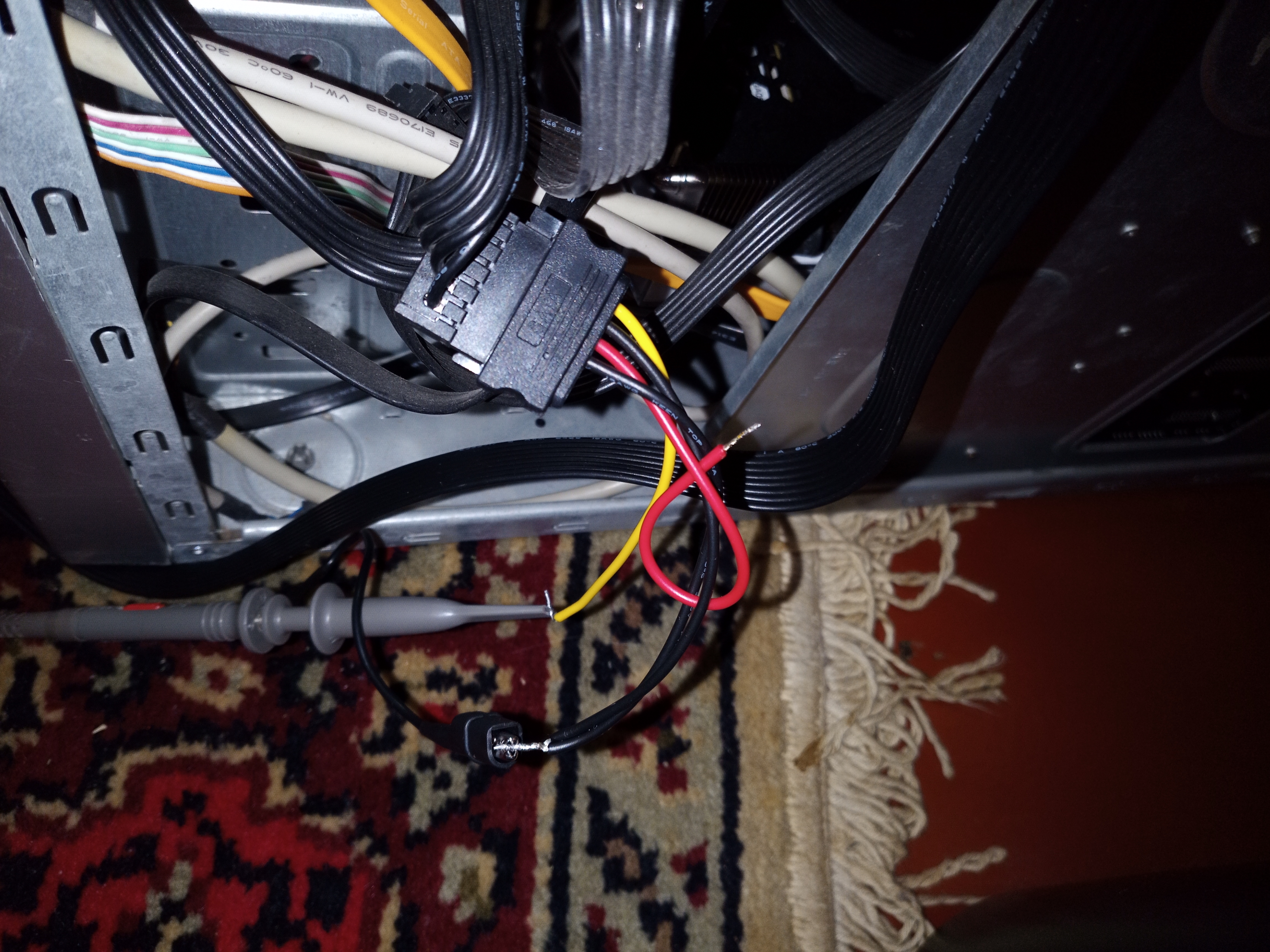 выше фотка как прицеплен щуп. Цепляю к блоку на sata коннектор переходник с SATA на молекс, со срезанным молексом и на эти контакты цепляюсь. Нагрузку даю нихромом через переходники 8pin pci-e. Кстати тот блок, что единственный с пульсациями на нихроме выше регламентных Cougar STX 750 (140mv) Имеет DC-DC Преобразователи и 20000uf общей емкости на 12в линии (teapo). при том что он работал всего год. А санный KSAS 700 (с емкостью 5000uf, но тоже teapo) который стоял у челика в риге 3 года 24\7, по той же методике тестирования с пульсациями в 60mv. p.s. если цепляюсь неправильно. Дайте совет. Завтра перемеряю и выложу фото.