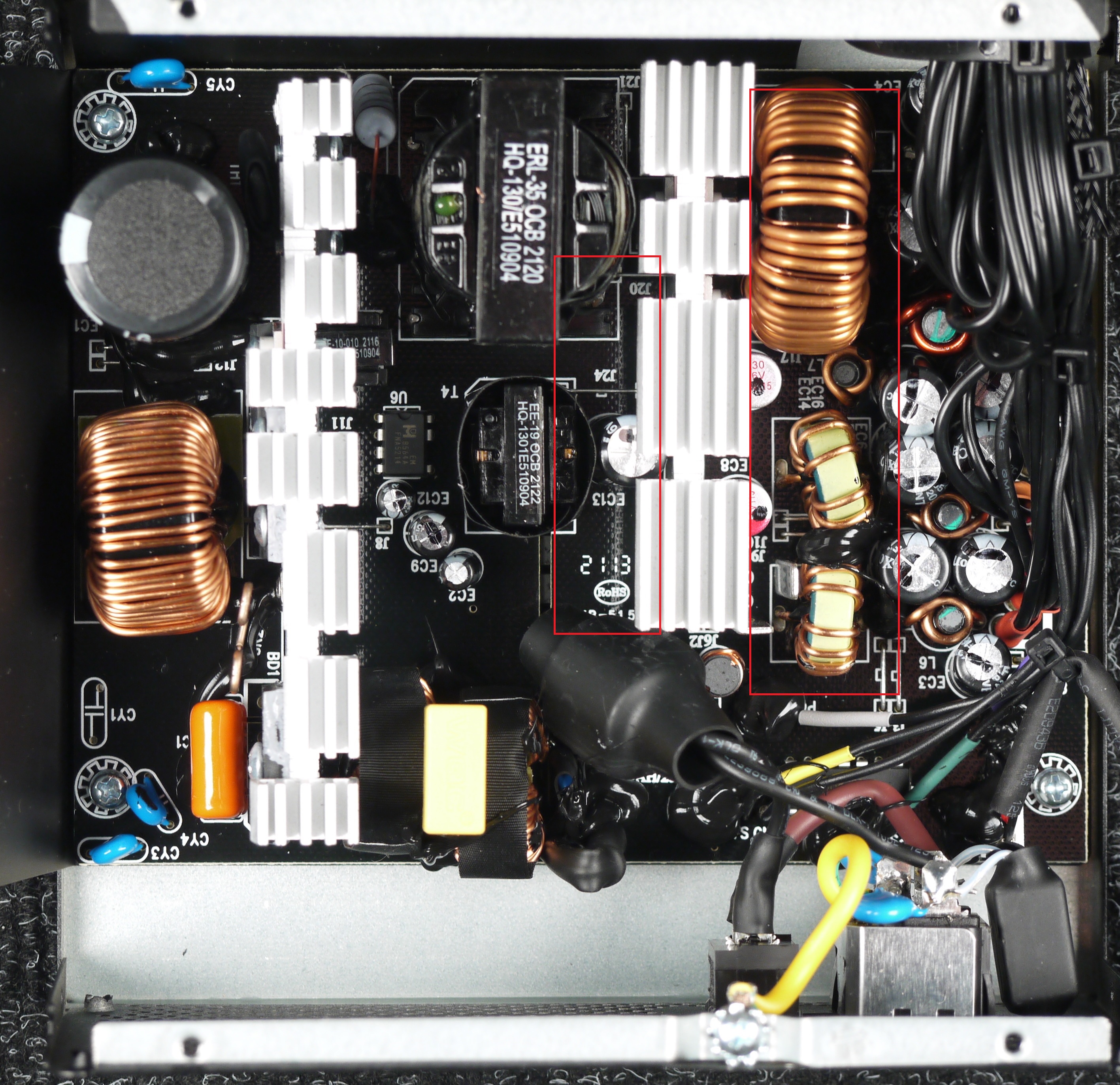 Очень редко бывает что два дросселя есть по выходу, но это не групповая стабилизация, тогда они одинакового размера и рядом с трансформатором есть ещё 2 маленьких дросселя (в таком случае топология LLC + DMA)