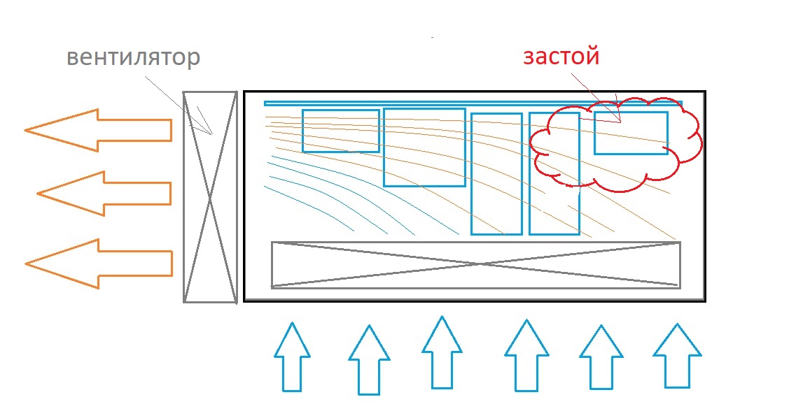 нарисовал как сумел, элементы в БП нарисованы условно. просто как идея для эксперимента. нужно проверять, замерять температуры. в пассивном режиме и так всё понятно что нагретому воздуху "самому не выйти"..