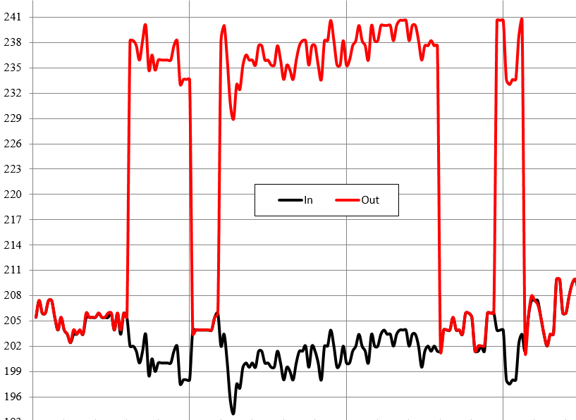 Вот графики входного и выходного напряжений за период порядка 8 часов