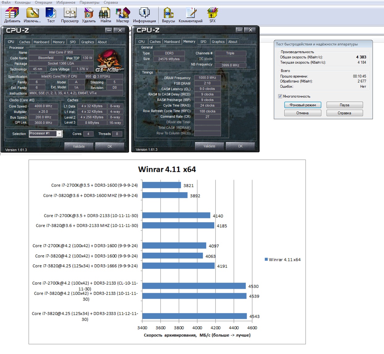 MASTER. винрар - это самое чувствительное к пропускной способности подсистемы памяти реальное приложение из известных мне. тут спору нет. вот только могу сказать точно про любой архиватор (винрар не исключение), что встроенные тесты производительности не сходятся с реальными процессами, когда реально что-то архивируешь. поэтому не рекомендую обращать внимания на встроенные тесты, только на реальное архивирование. прогоните винрар с разной памятью в реальном деле. и выложите (ну хотя бы текст "от руки") результаты тут, для сравнения со встроенным (прирост от скорости памяти).