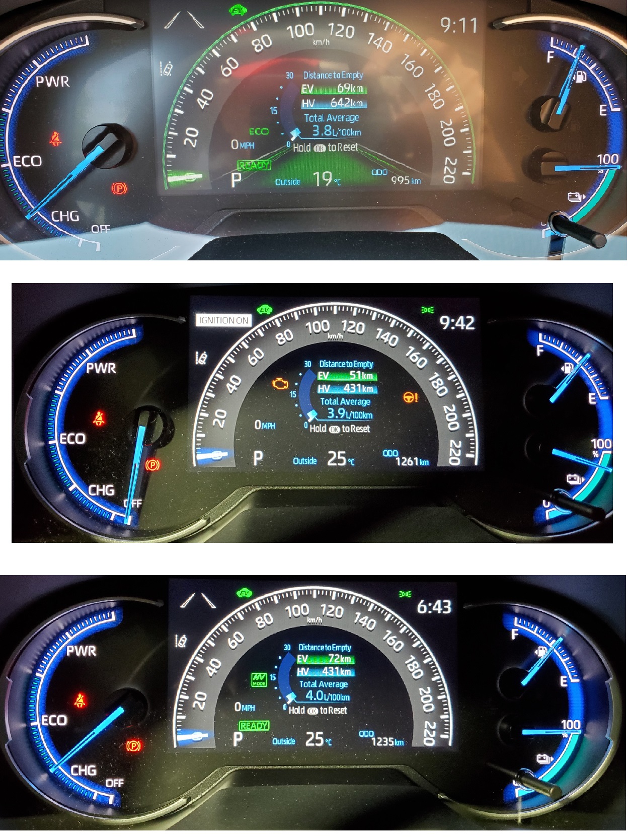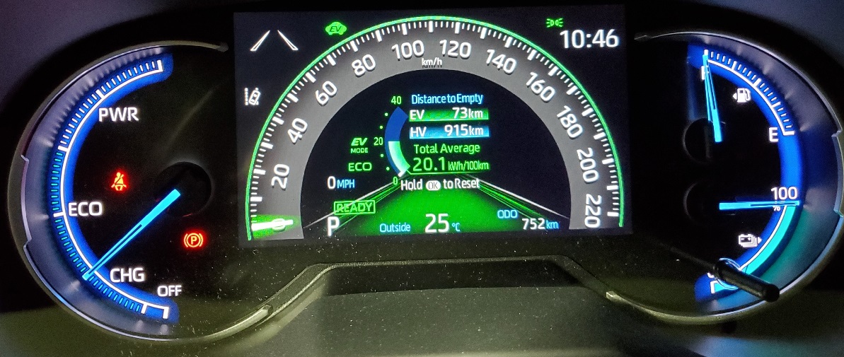 До коттеджа туда и обратно расстояние 511 км, и в электро-бензиновом гибридном режиме (HV) пока что расходовалось 4.7л/100км бензина (Regular, АИ-92). Для кого-то может показаться что много. Но нужно учитывать что наш полноприводный гибридный SUV с багажным отделением (объёмом порядка 2000 L) при сложенных задних сиденьях ездил полностью загруженным. И мы сравниваем с нашим предыдущим среднеразмерным SUV AWD с салоном и богажным отсеком примерно тех же размеров, который имел V6 240 л.с., и его расход бензина был более чем в 2 раза выше. К тому же учитываем что по городу в нашей семье расход бензина ноль. Заводом такая ситуация предусмотрена, и для неё рекомендовано каждые 12 месяцев выжигать из бака хотя бы половину бензина. Который во времени деградирует.