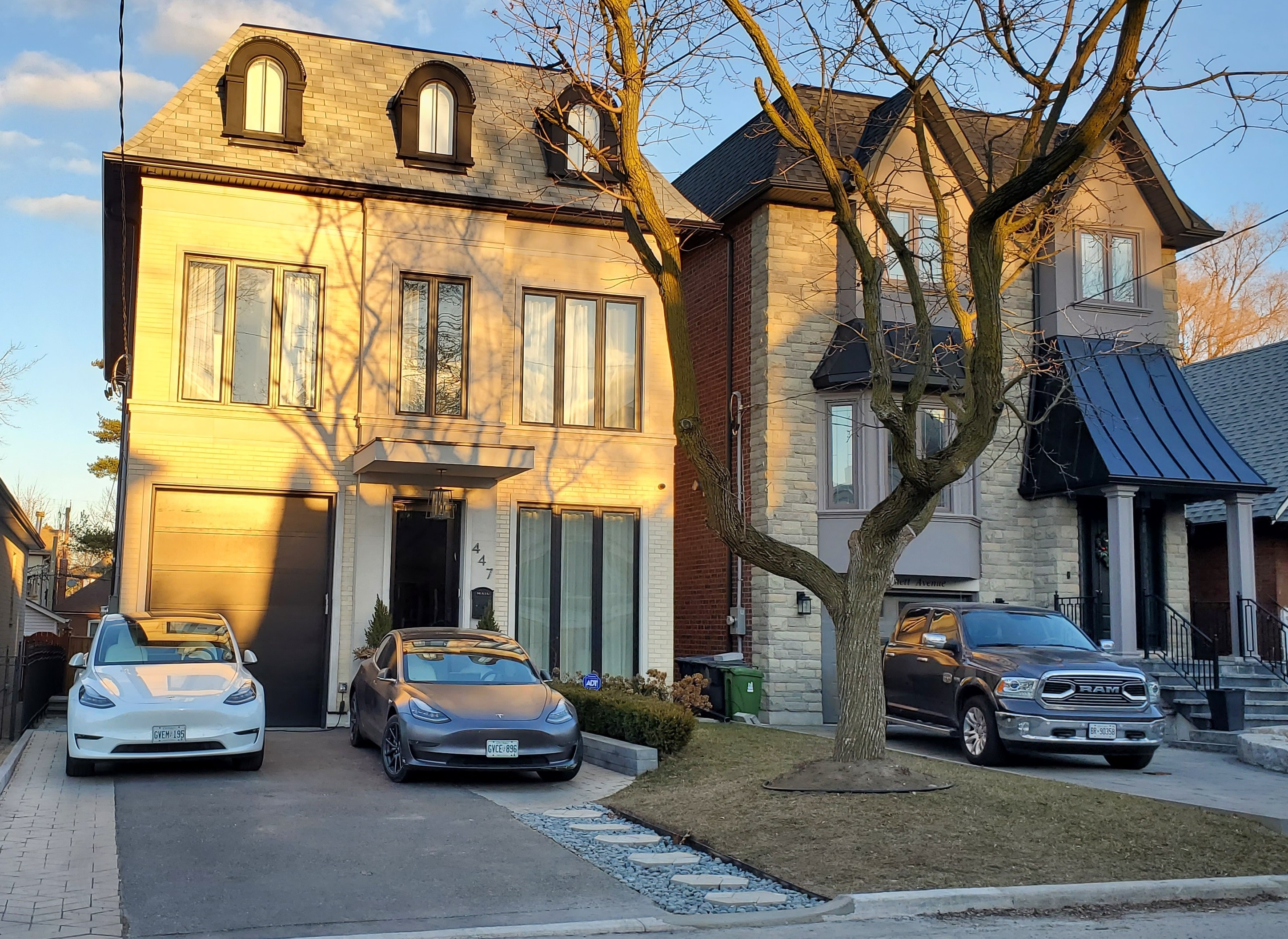 А если по теме, - то в моём соседстве на расстоянии 3-10 мин пешком от дома уже много электромобилей Tesla. Ниже на фото слева домовладение в котором когда-то были естественно только бензиновые автомобили. Несколько лет назад у них появилась одна Tesla. А теперь две Теслы, - в качестве первого и второго автомобиля в семье.