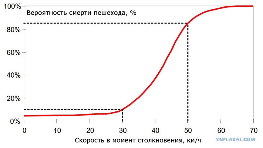 А вот это правильный ответ Суть проблемы понятна на самом деле, тормозной путь увеличивается нелинейно и вместе с ней скорость при столкновении, но точные цифры тут не укажешь, потому что всё зависит от каждого конкретного случая.