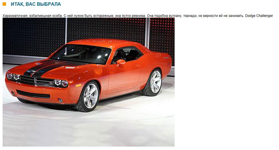 мдя... вот энто я отжег.... по тесту Danmerpro [i]Сила, и мощь этой машины поражает. Сесть за руль такого зверя решиться не каждый, но именно вас она приглашает на водительское сидение. На дороге ведет себя строго и размеренно, внушая страх своими габаритами. Если вас выбрала эта машина, то вы способны на многое. Hummer H1 Alpha http://image.trucktrend.com/f/9355972/1 ... pna.jpg%22
