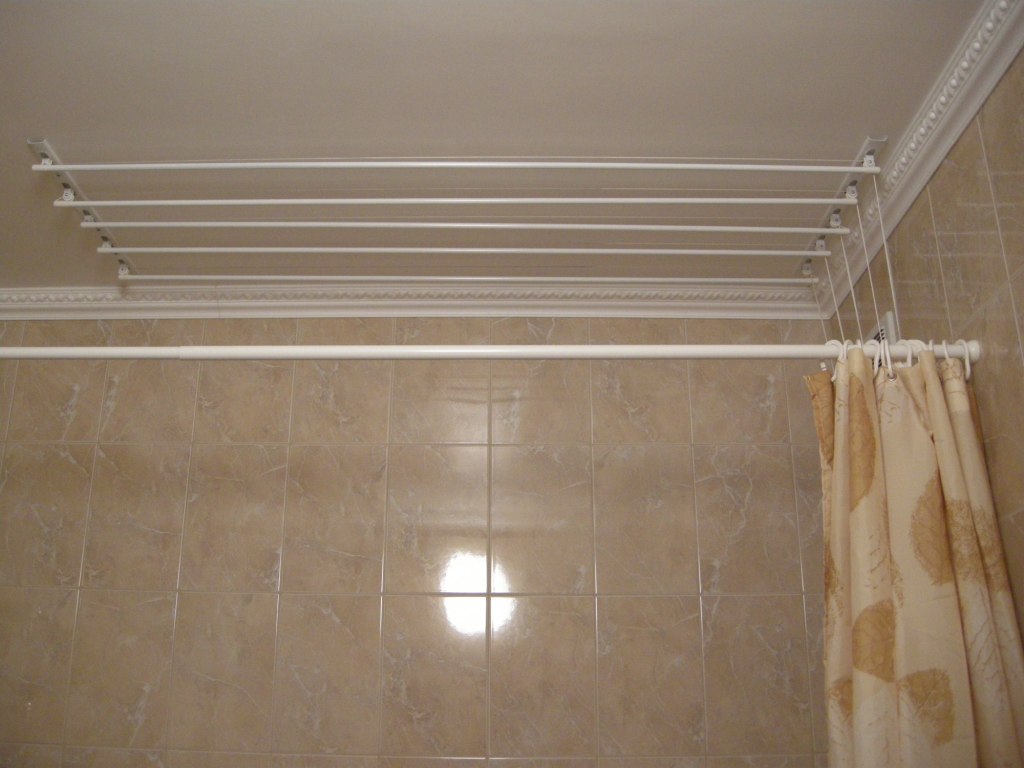 мыца мешают по сути только какие-нибудь простыни... все же под потолком висит на перегибе... т.е. грубо говоря, какое-нибудь полотенце не длинное или футболку ты даже особо не замечаешь, ну болтается над головой и фиг с ним... Да и подвинуть на время мытья или дополнительно еще раз перекинуть через перекладину - не вопрос...