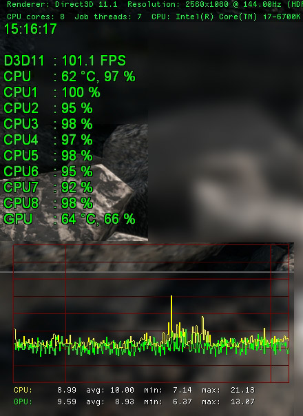 разогнал 6700К до 4700 МГц + 1080 Ti все равно все потоки проца загружены на 95%, видеокарта на 65-75%. 101-110 фпс на Сен Кантене на точке Б (монастырь, где постоянный спам взрывов). все на ультра. 2560*1080 (21:9) 144Гц.