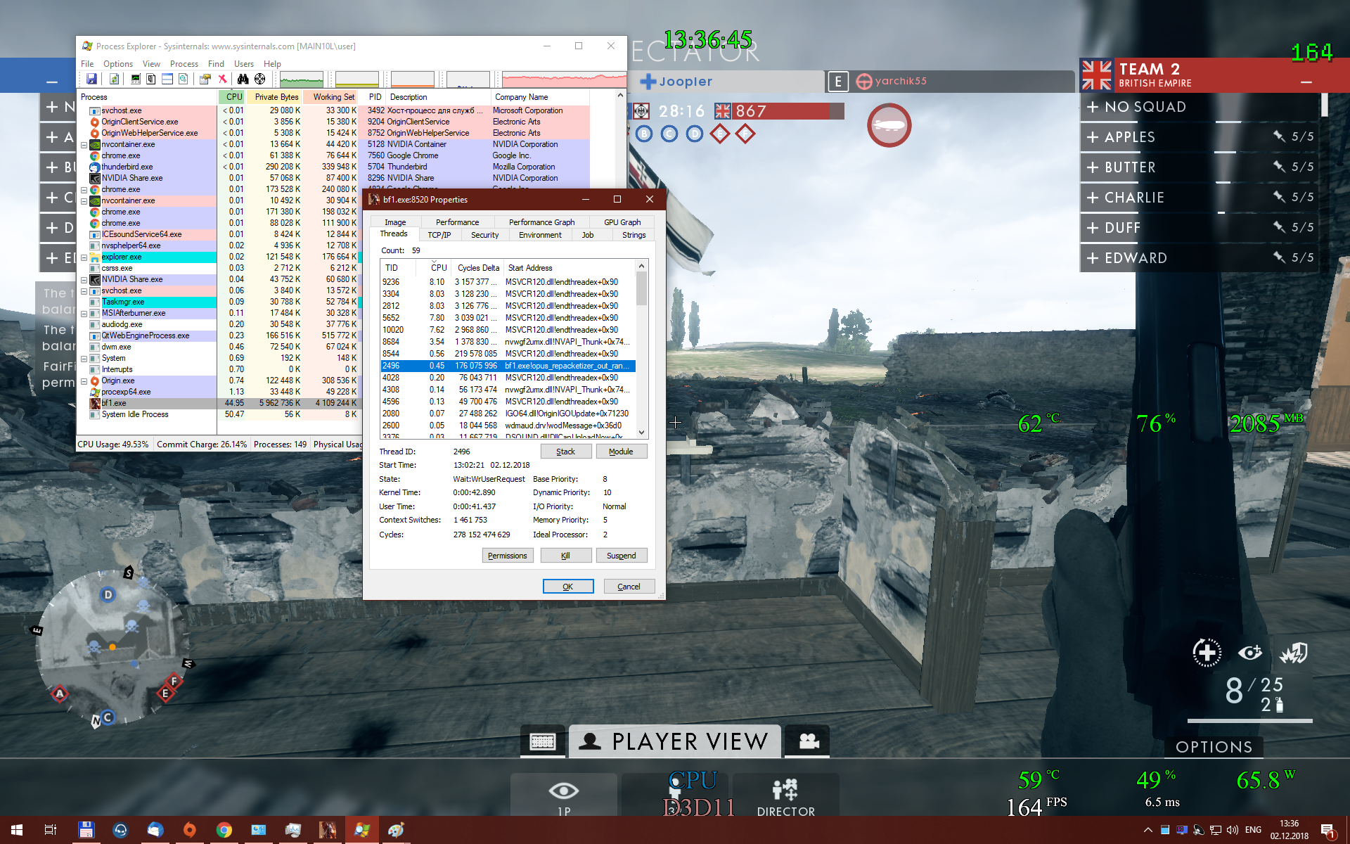 Надо смотреть через process explorer, что в этот момент происходит, типичное состояние BF1 это 5 потоков + 0.5 драйвер d3d11 nvidia + мелкие потоки, которые нет смысла брать в рассчет.