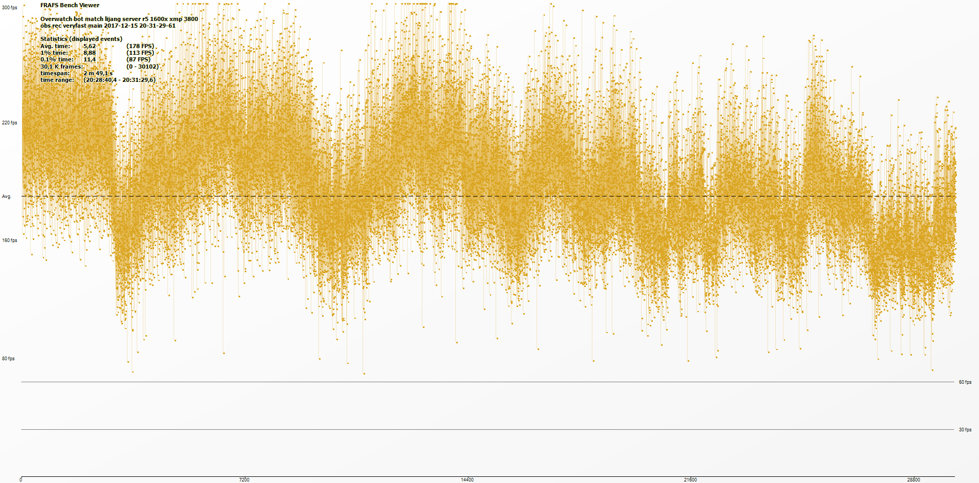Так и те отставания что есть, они не ужасные в плане абсолютного фпс, он играбельный что там что там. Но ведь цена платформ сопоставима, а вот результат вполне существенно различается. И то что видно на глаз по цифрам на счетчике, то фреймтаймы вряд ли спасут. У меня есть фреймтаймы обычных игр без стрима. А в командных мне сложно не пропустить все эти моменты когда начать и остановить бенч чтобы получить релевантный замер без спайков до 60фпс в меню и т.п. Я просто не хочу заниматься этим в ущерб вниманию сфокусированному на соревновательной игре. Если бы можно было в одну кнопку сделать замер, было бы хорошо, но если фрапсом сделать бенч на всю катку/катки он получится нерелевантным.