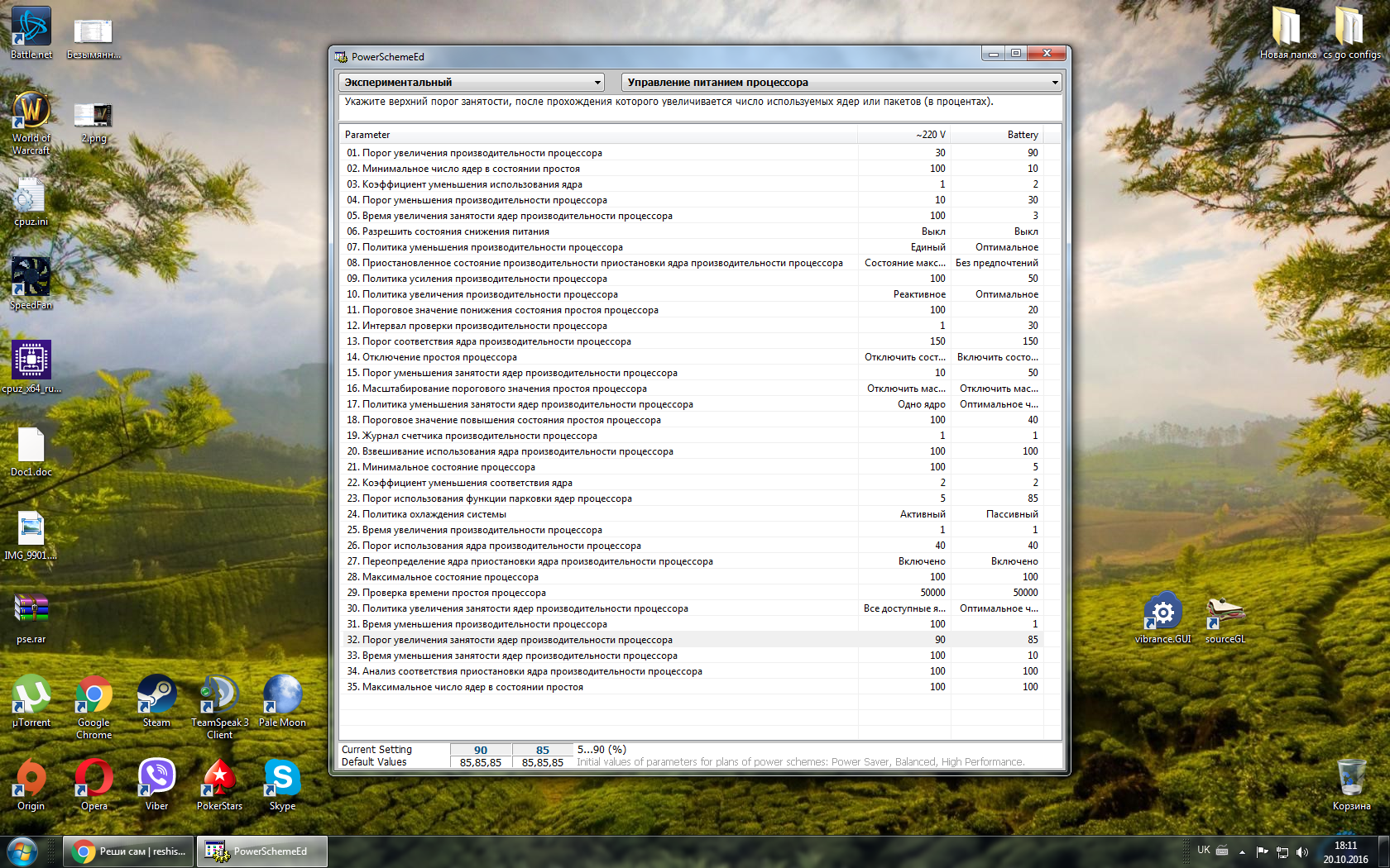 UPD пока скидываю только названия этих настроек (завтра отредактирую с описанием и значениями по умолчанию): Порог увеличения производительности процессора Минимальное число ядер в состоянии простоя Коэффициент уменьшения использования ядра Порог уменьшения производительности процессора Время увеличения занятости ядер производительности процессора Разрешить состояния снижения питания Политика уменьшения производительности процессора Приостановленное состояние производительности приостановки ядра производительности процессора Политика усиления производительности процессора Политика увеличения производительности процессора Пороговое значение понижения состояния простоя процессора Интервал проверки производительности процессора Порог соответствия ядра производительности процессора Отключение простоя процессора Порог уменьшения занятости ядер производительности процессора Масштабирование порогового значения простоя процессора Политика уменьшения занятости ядер производительности процессора Пороговое значение повышения состояния простоя процессора Журнал счетчика производительности процессора Взвешивание использования ядра производительности процессора Минимальное состояние процессора Коэффициент уменьшения соответствия ядра Порог использования функции парковки ядер процессора Политика охлаждения системы Время увеличения производительности процессора Порог использования ядра производительности процессора Переопределение ядра приостановки ядра производительности процессора Максимальное состояние процессора Проверка времени простоя процессора Политика увеличения занятости ядер производительности процессора Время уменьшения производительности процессора Порог увеличения занятости ядер производительности процессора Время уменьшения занятости ядер производительности процессора Анализ соответствия приостановки ядра производительности процессора Максимальное число ядер в состоянии простоя