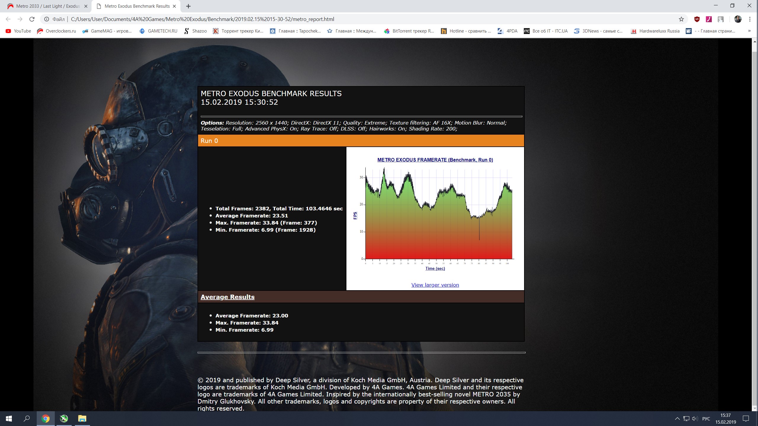 Игра на ссд, но дропы во время подгрузки уровня есть, прям чувствуешь когда подгрузка идет, тут не плавно сделали... Но я на такое внимание не обращаю. Есть именно сцены где фпс в районе 52-56 , в начале когда Артем выходит из лазарета и тея толпа персонажей встречает, тяжелай сцена и в ней вот такой фпс... потом еще пару раз было 50+ , но вот интересно как оно будет в том же лесу, я бенч прогнал, чет ад какой то...