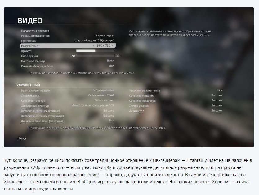 *При запуске вылетает с ошибкой "Failed to CreateGameWindow. Resolution unsupported" В [Documents]\Respawn\Titanfall2\local\videoconfig.txt прописываете свое разрешение: "setting.defaultres" "1920" "setting.defaultresheight" "1080"