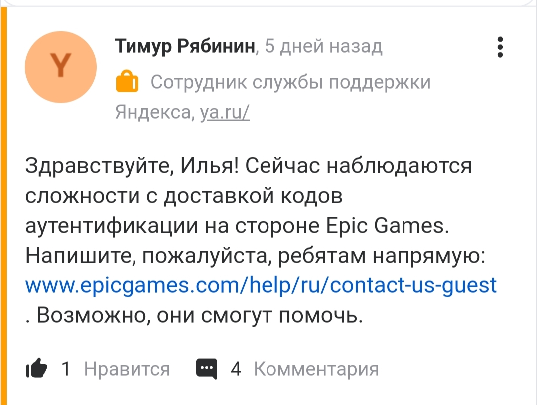 На Яндекс почту не приходят коды уже недели две. Я не один такой. Запустил восстановление аккаунта со сменой почты (тыкнул типа у меня нету доступа к текущей почте когда заполнял формы, там ещё запросят данные чтобы подтвердить владение аккаунтом). Проблема массовая, проблема на стороне epic games, уже даже почта Яндекса ответ разместила в вопросах mail.ru что у них все работает. Без входа в аккаунт тупо не возможно связаться с поддержкой epic. Запрос создал 24 февраля, ответа нет. Добавил Сегодня 27 февраля получил отказ, говорят создавай новый запрос и уточняй данные. То есть рассматривали трое суток . Новый запрос создавать не могу, система пишет что восстановление аккаунта в процессе, когда оно сбросится без понятия
