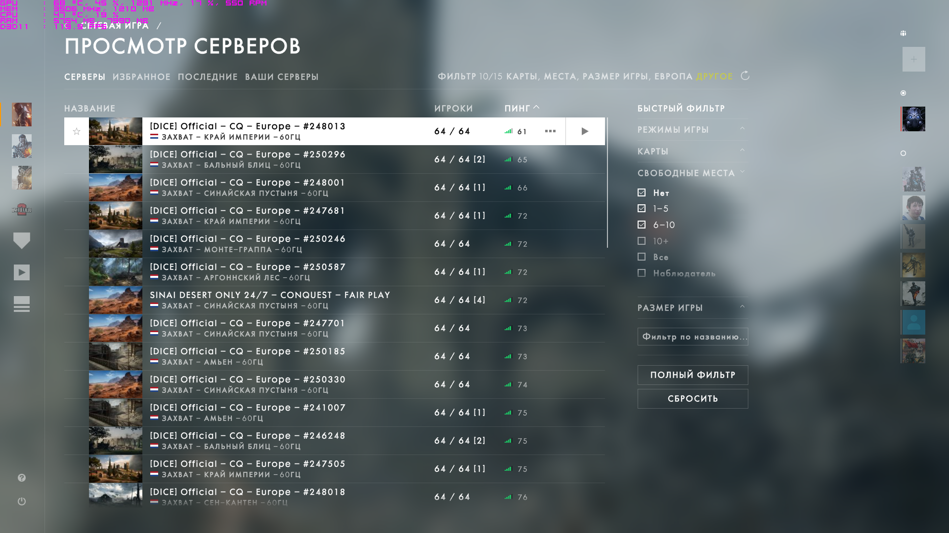 Я по вечерам играю, вроде очень много Европейских серваков Official TSNP и Official Dice, так чтоб не поиграть - никогда не было. На премиуме приоритетная очередь, можно даже на забитый сервак залезть, все равно везде есть чуваки у кого бомбит и они выходят. Вчера искал серваки с названием active admin, попал на СПБ сервак на Форт Во, люди вообще по другому играют, не так как иностранцы. Много крабов еще хуже чем я.. Но были и интересные ребята, сразу видно, что в cs играли, смотрят попиксельно в прицелы из-за углов. Я в проходе очень долго с одним типом пытался перестреляться, так мы друг друга и не убили.