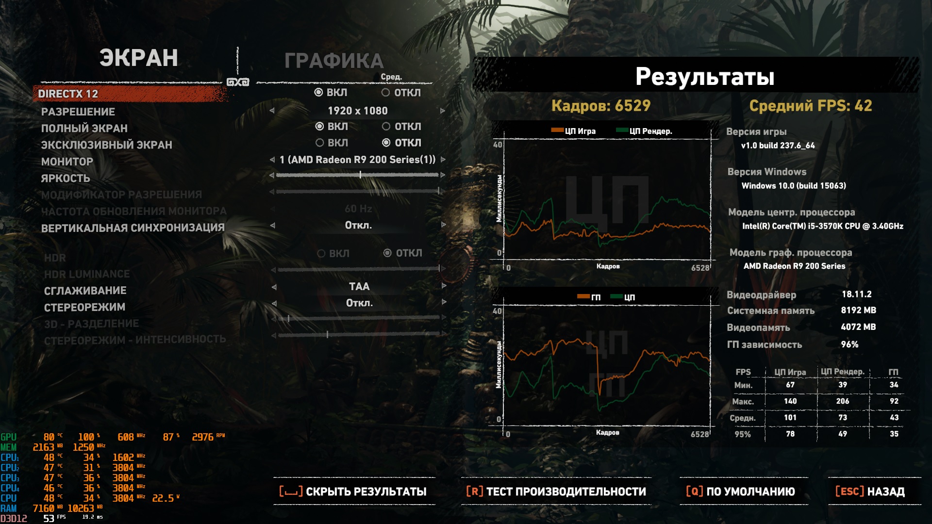 Вот тест на i5 3570k 4-х ядернике под dx12. Проц. загружается на 100% только при смене сцен, так нагрузка на ЦП в игровом режиме прыгает от 30% до -80% в зависимости от сцены. Ну это к слову для тех, кто считает, что 4х ядерник не вывозит игру.