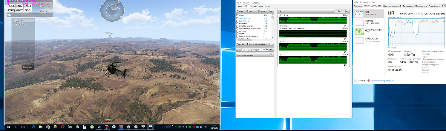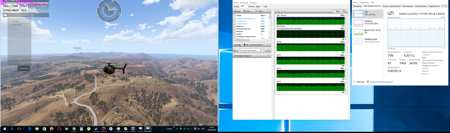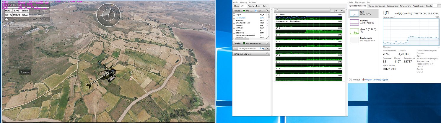 итак поясню кратко создал в редакторе простенький сценарий - полет на ветолете. сделал 3 скина - 2 ядра(потока) / 4ядра(потока) / 4ядра +НТ (8 потоков)