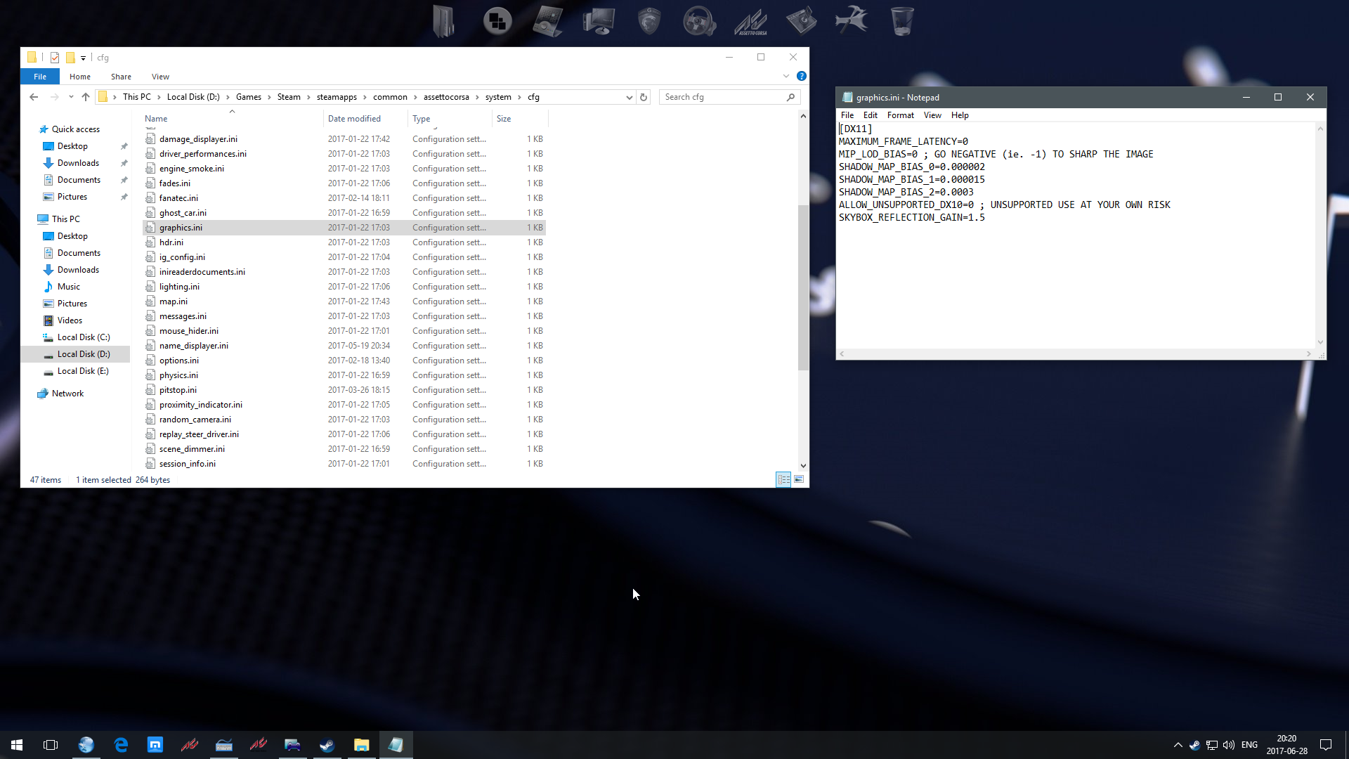 MAUZERISLT 2 файла graphics.ini я нашёл через поиск, они есть по этому пути assetto corsa\steamapps\common\assettocorsa\sdk\editor\system\cfg и assetto corsa\steamapps\common\assettocorsa\system\cfg, но если зайти напрямую в эти папки, то их там не будет. Видно это хитрость такая разрабов, чтобы не правили этот файл. Изменил в обоих файлах ALLOW_UNSUPPORTED_DX10=0 на ALLOW_UNSUPPORTED_DX10=1. Эффекта нет.