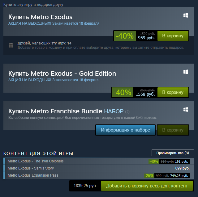 Подскажите по MetroExodus в Steam; сто лет не заходил. Какую покупать: Metro Exodus Expansion Pass=24.99 евро; Metro Exodus Sam`s Story=17.99 евро; Metro Exodus - The Two Colonels=4.79 евро. Я так понял, что за 24.99 евро. Спасибо. 47,77€-добавить в корзину весь доп. контент.