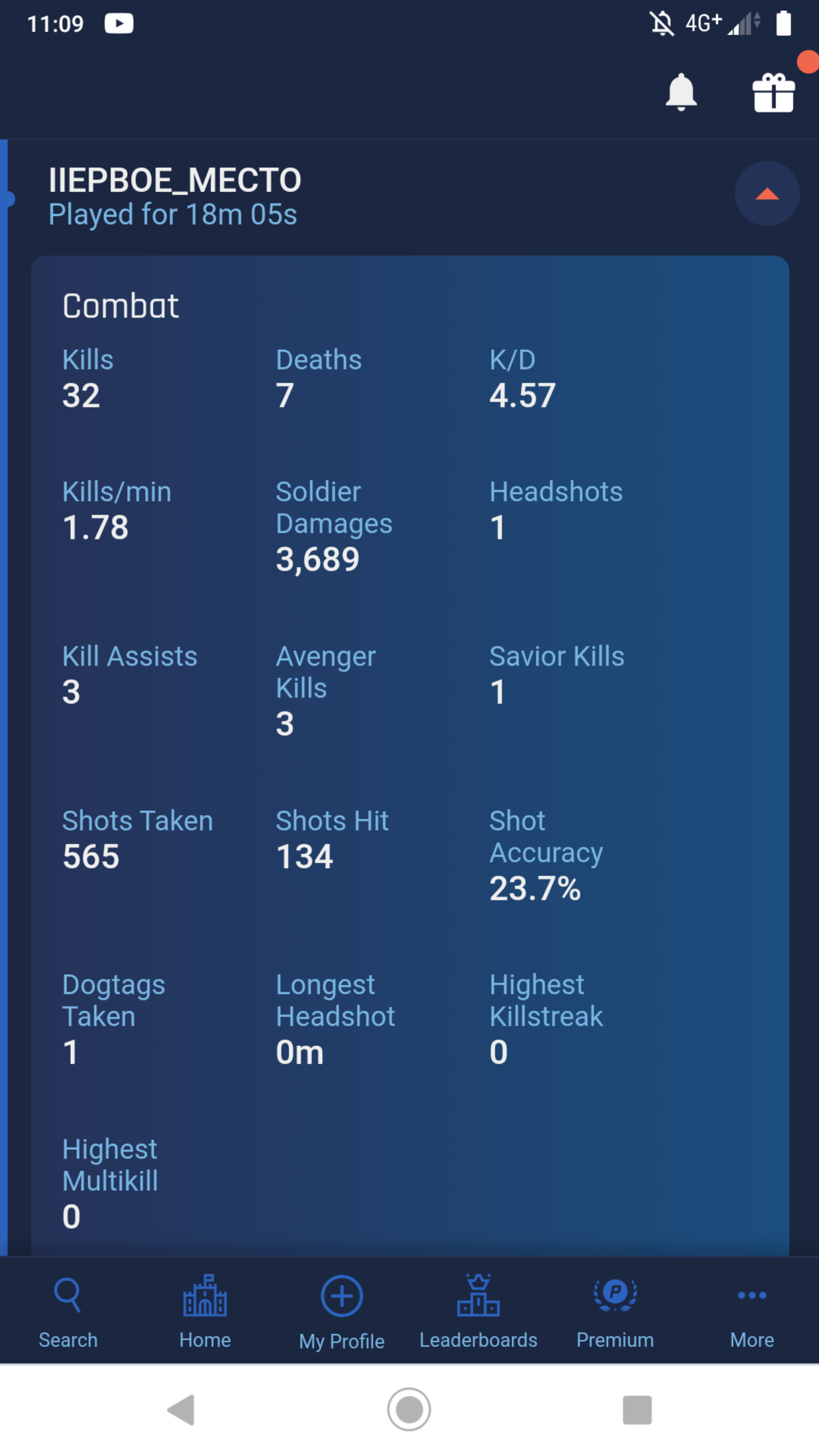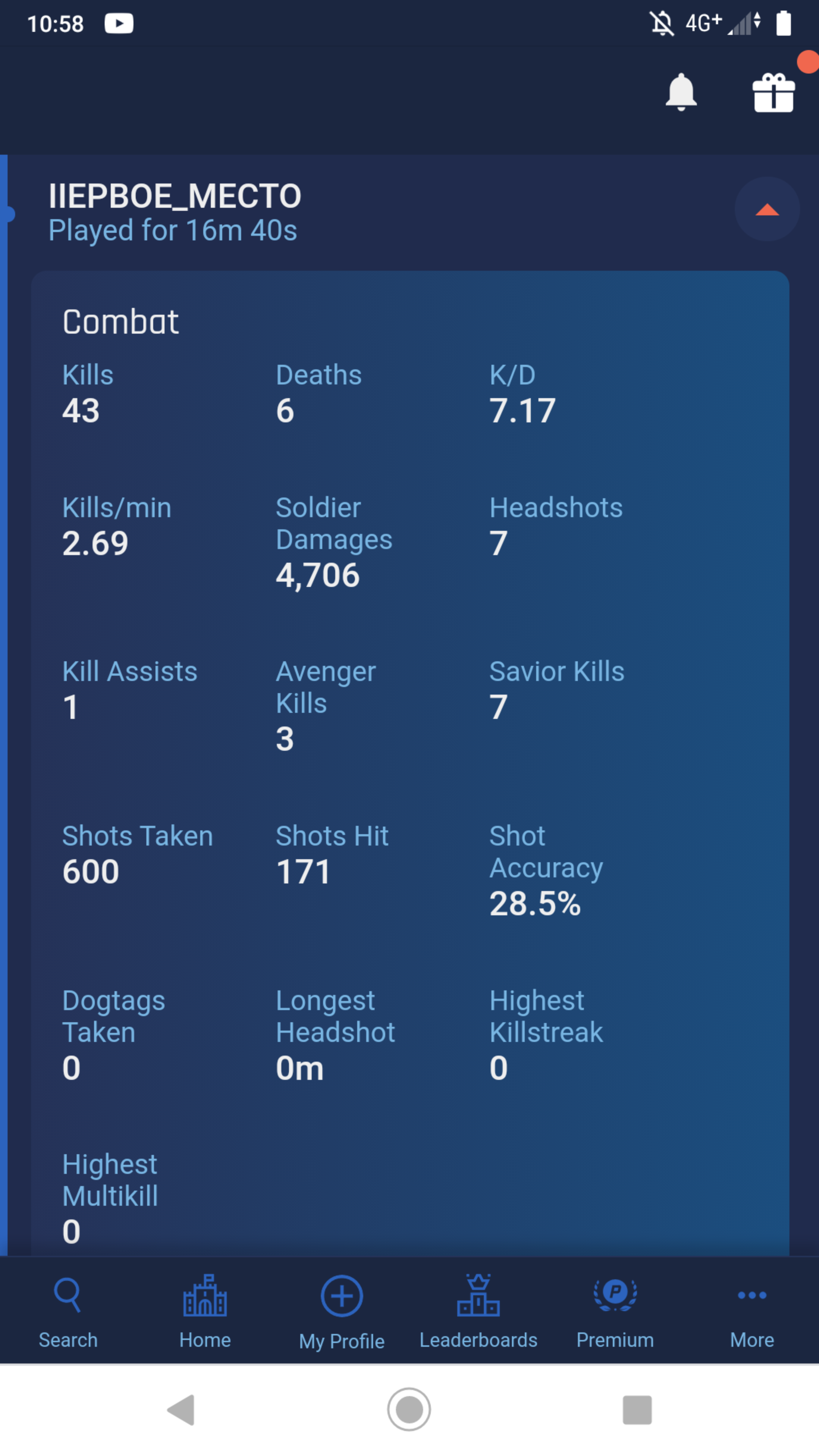 Добавлено спустя 2 часа 37 секунд: что-то меня напрягпет это нашествие низких уровней. То ли им всем нолик в цифре дорисовать забыли, то ли это бывшие перебаненные читаки на новых аккаунтах. Одного сегодня встретил - точно читак. 17 уровень ,не умеет вообще бегать, но всегда знает где ты и убивает. Типа, если я делаю обманку и прыгаю со 2 этажа, то это срабатывает в 100% случаев, тебе на голову падает чувак с мг42, со скорострельностью примерно 500 единиц ХП в секунду, но ты его перестреливаешь из стена. Ты либо гений тактики, либо ссаный читак, который тупо по ВХ увидел и начал стрелять в окно префом. В итоге оказалось второе - в следующем бою он конкретно попалился.