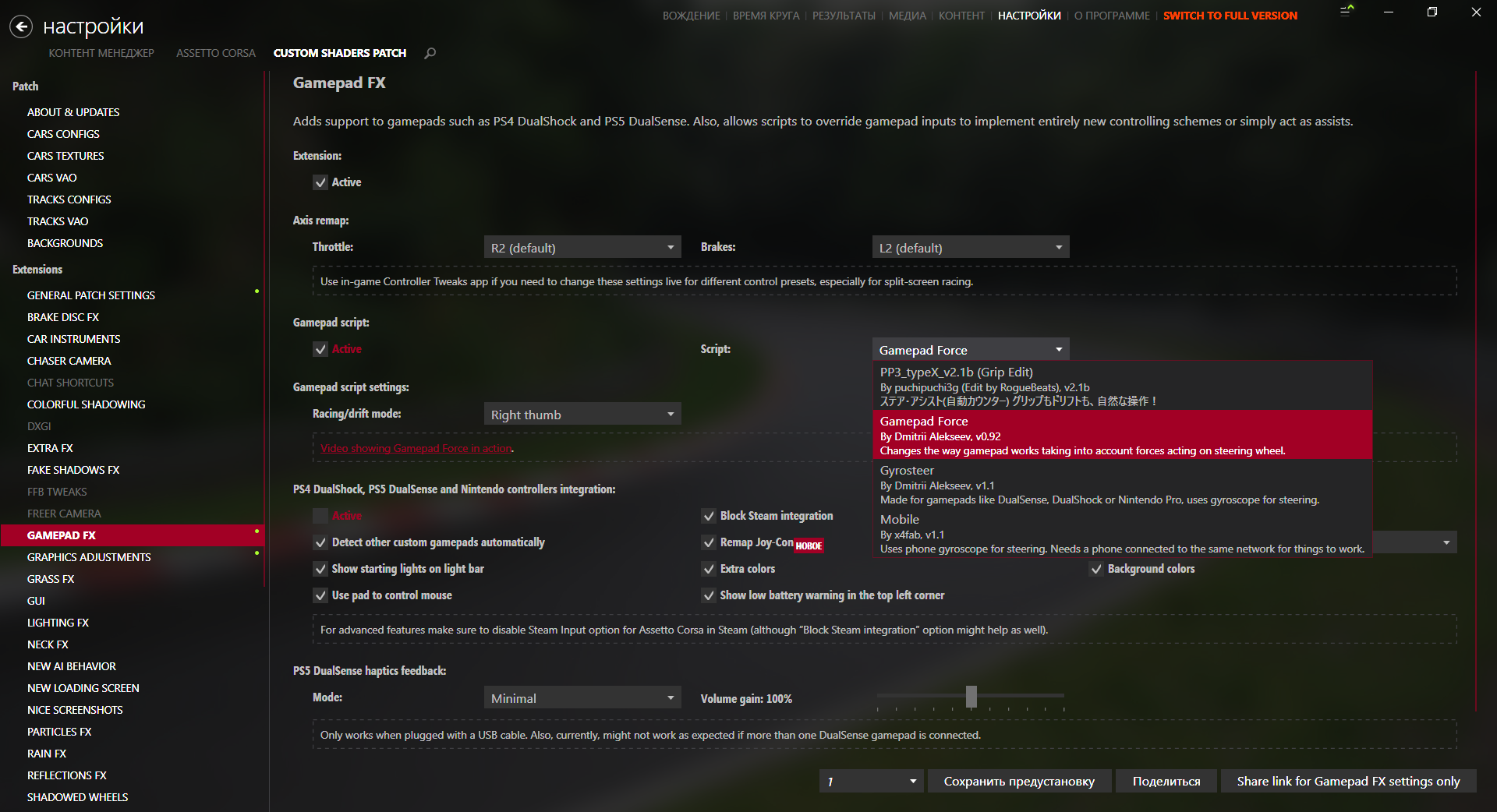 ps. для настройки чувствительности сначала крутите параметр "Filter", "Gamma" и "Speed sensivity", и только в конце "Speed", если нехватает остроты руления, но советую все же оставлять "Speed" на 1 или 2 поначалу (например speed 2 + filter 50 для более быстрой перекладки руля, speed 1 + filter 100 для уменьшения рысканья и избыточной поворачиваемости, и тд), т.к. наложение скрипта Gamepad FX с руля на геймпад пропорционально именно этому параметру. Поведение авто в корсе очень чувствительно к инпуту, поэтому на ограниченном стике геймпада разница заметна даже в сотых долях значений. Лучшие настройки покажет время на круге, конечно.