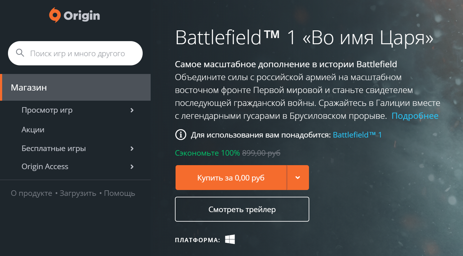 *Покупка подписки Origin Access даёт возможность 1 месяц играть в игры из списка The Vault, а также 10 часов пробной версии БФ1 с 2 сингловыми миссиями и доступом к мультиплееру, при покупке полной версии прогресс сохранится.